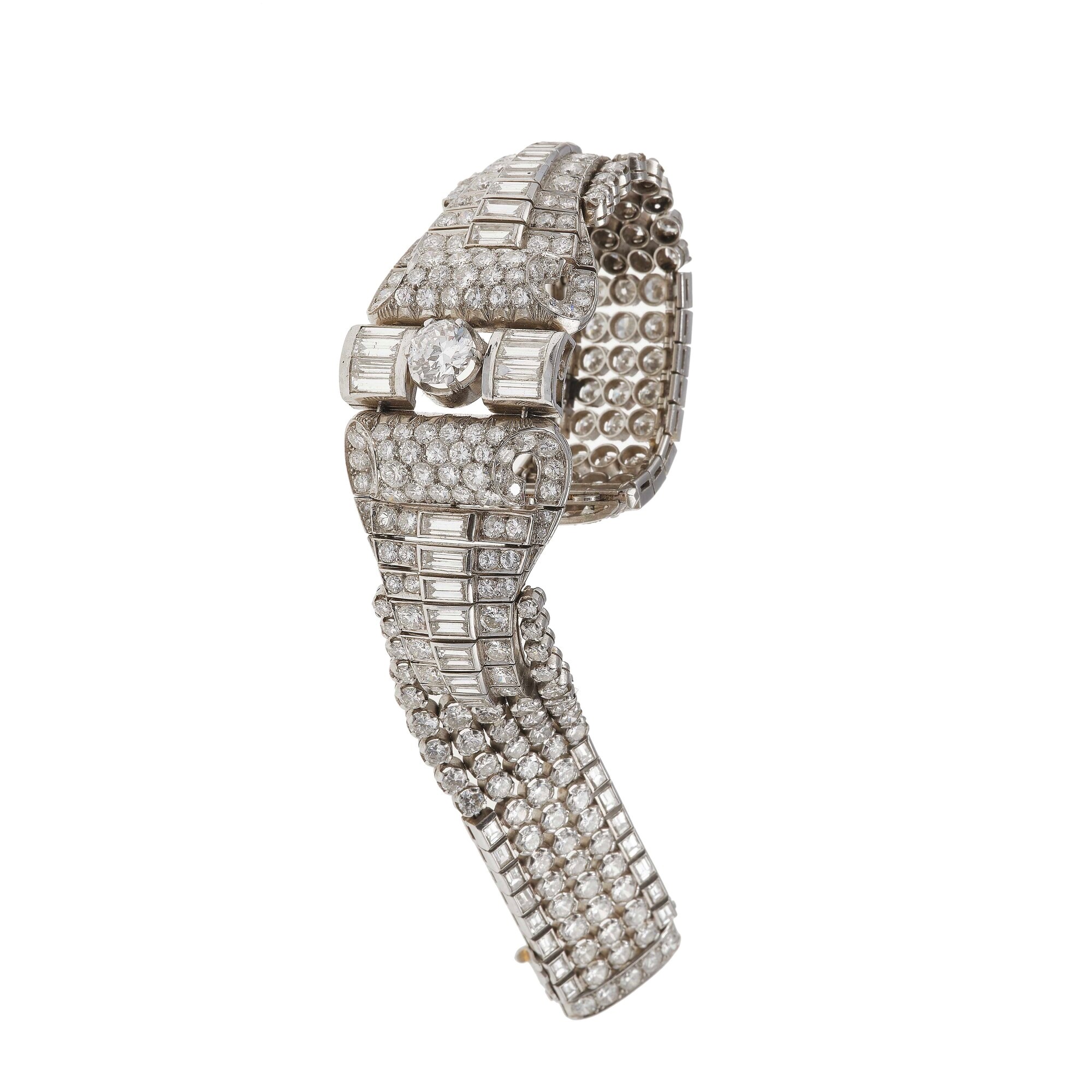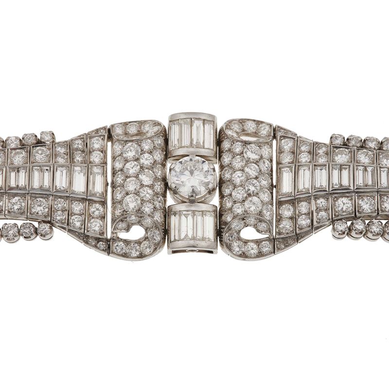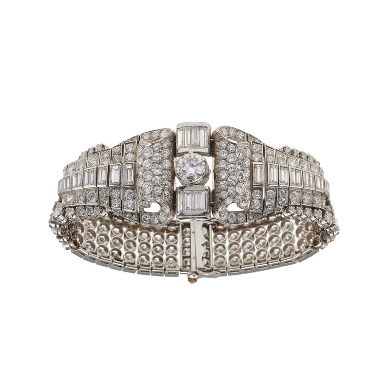 Diamond and platinum bracelet. Diamond weighing approximately 30.00 carats. Partially legible maker's marks