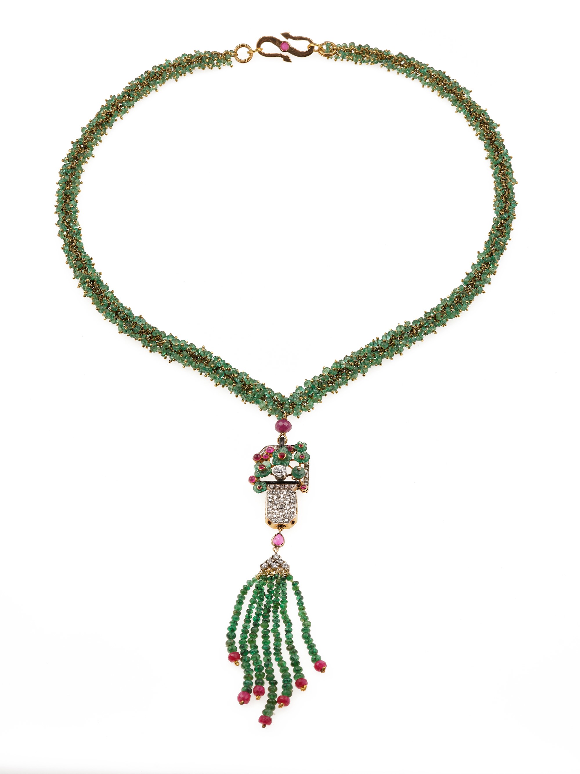 Emerald, diamond, ruby, enamel, gold and platinum necklace