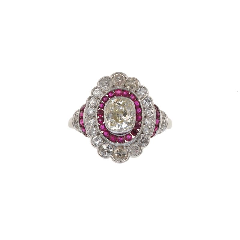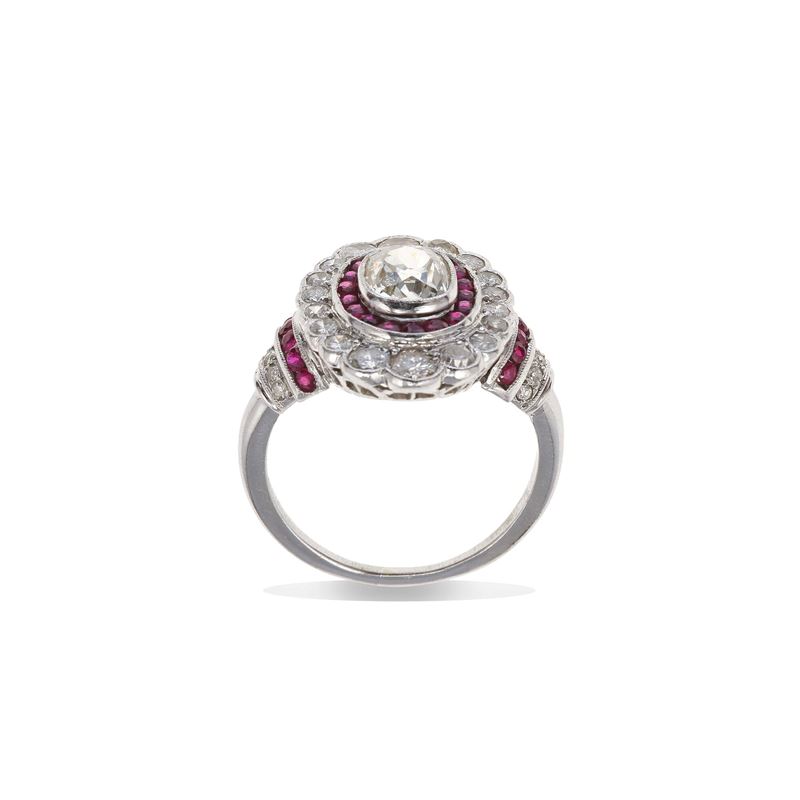 Old-cut diamond, ruby and platinum ring