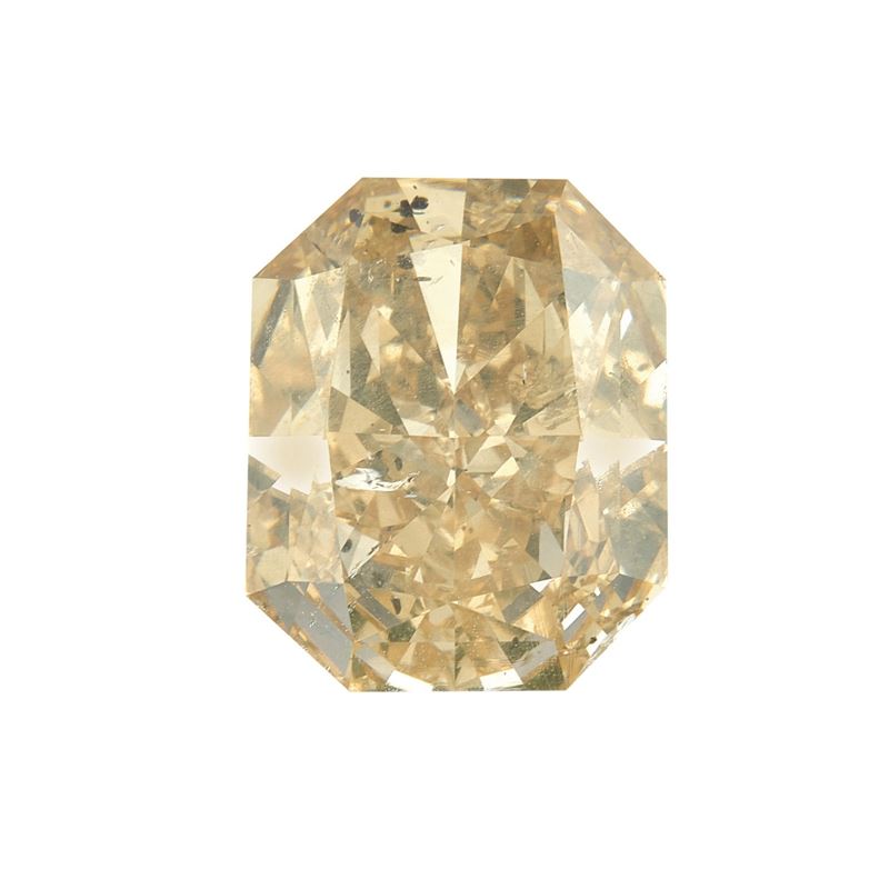 Rectangular faceted and step-cut diamond weighing 7.03 carats, fancy orangeish yellow, fluorescence medium. Gemmological Report CISGEM n. 10976/AAB