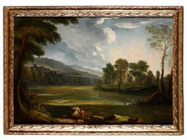 Scuola della fine del XVII-inizi del XVIII secolo Paesaggio fluviale con figure