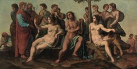 L'opera riprende con qualche piccola variante la celebre composizione che Raffaello Sanzio ideò per la decorazione della Stanza della Segnatura negli appartamenti di papa Giulio II in Vaticano