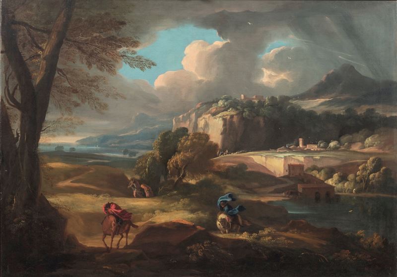 Scuola romana del XVII secolo Paesaggio con viandanti