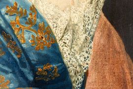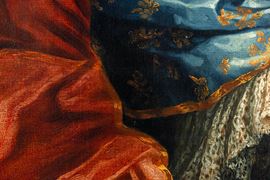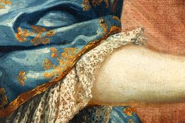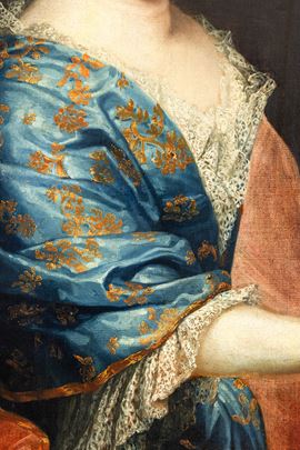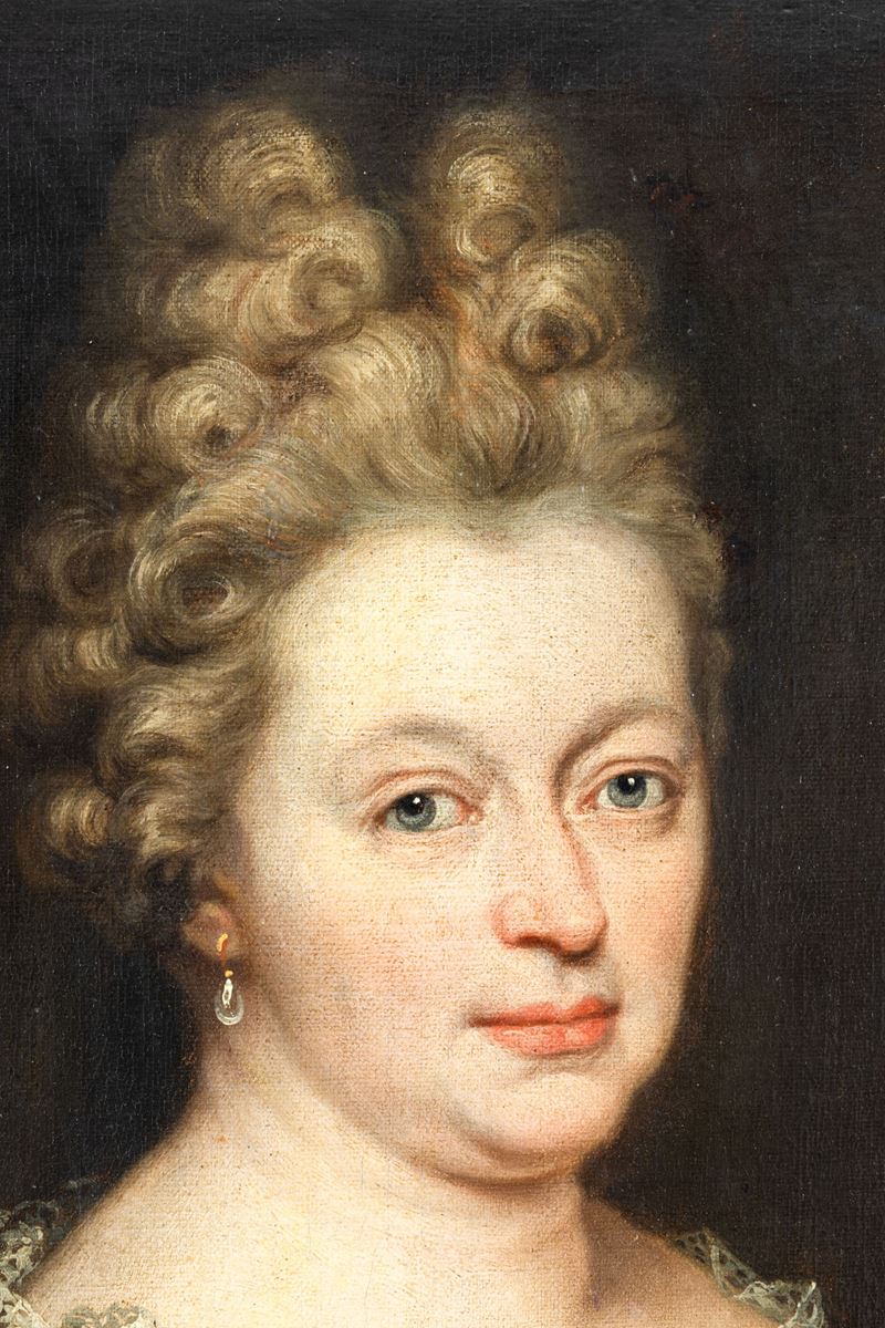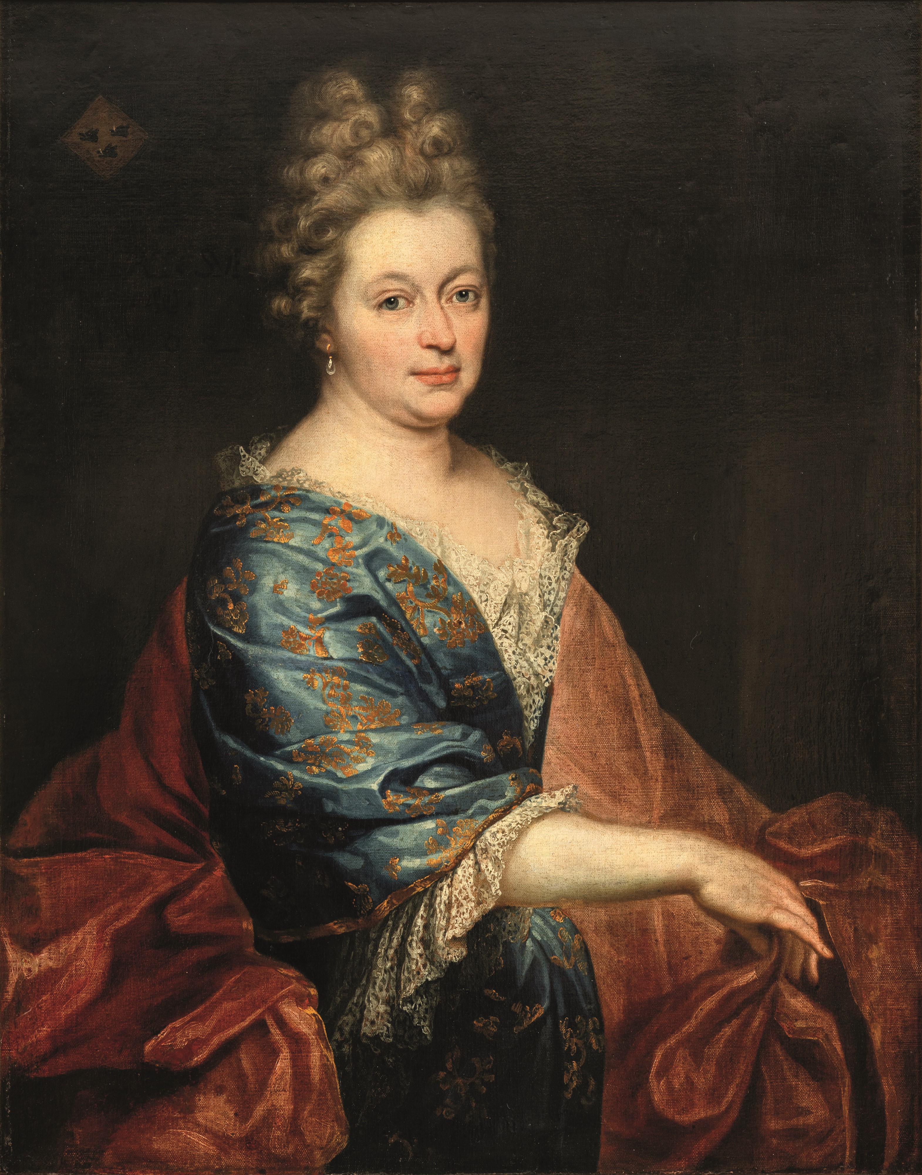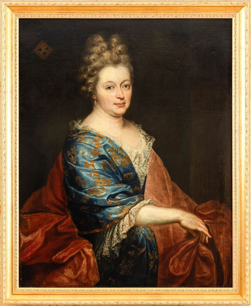 Scuola francese del XVIII secolo Ritratto di gentildonna con drappo rosso e stemma nobiliare