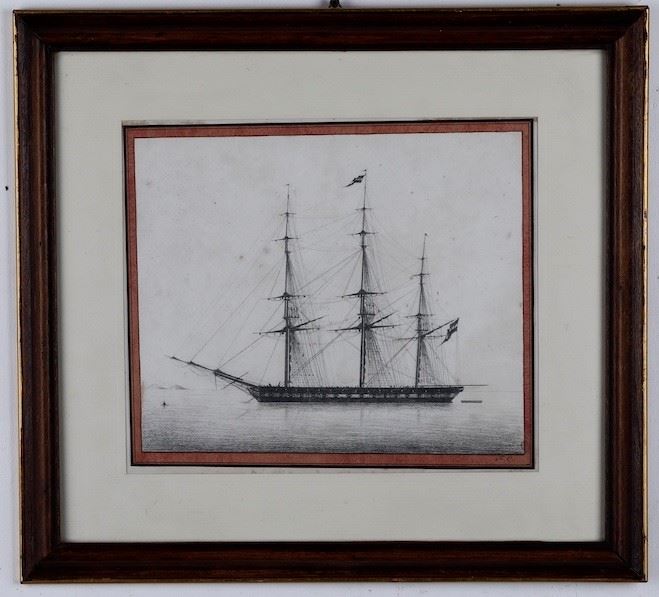 tre disegni con velieri, in cornice