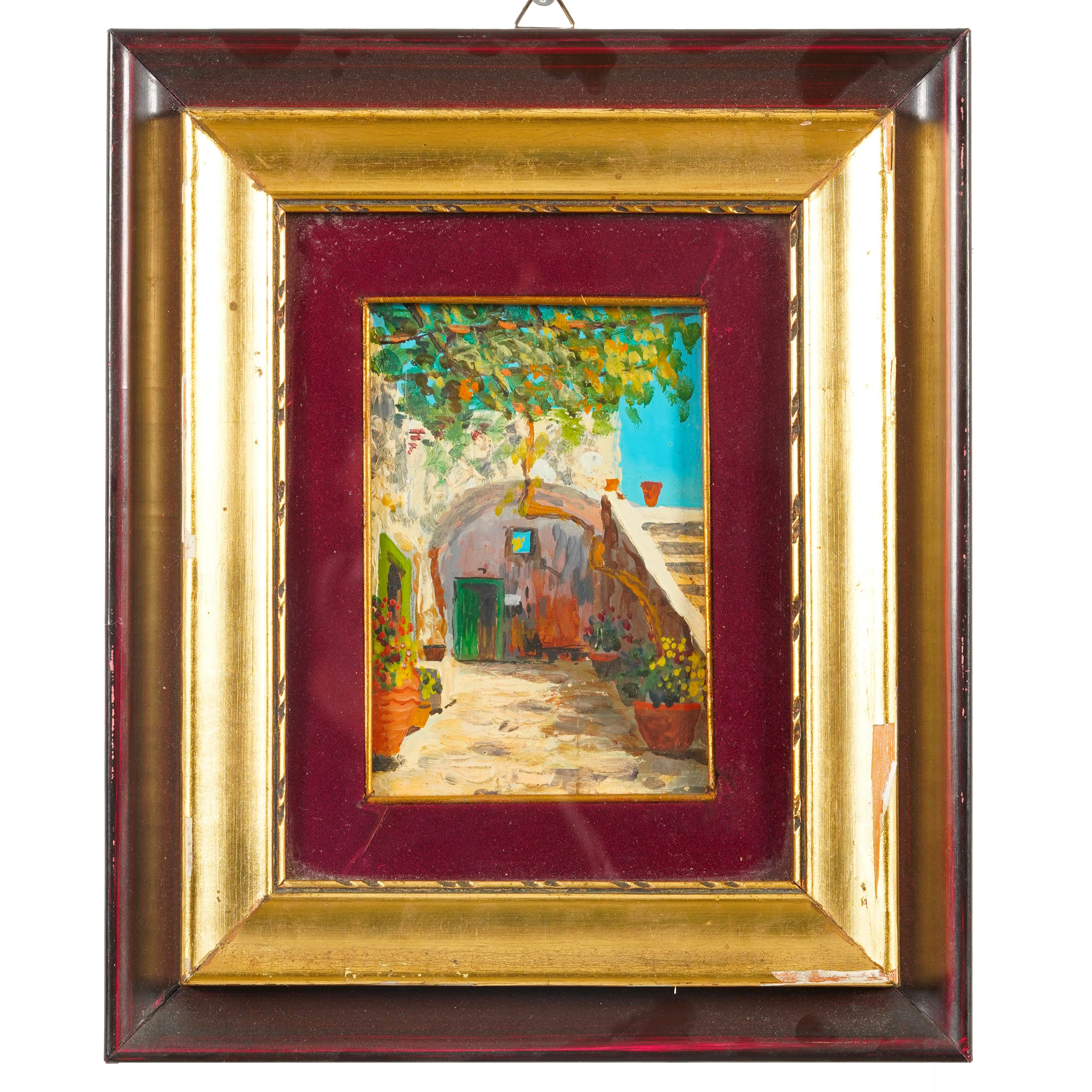 Olio tavola in cornice raffigurante cortile