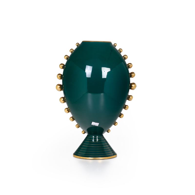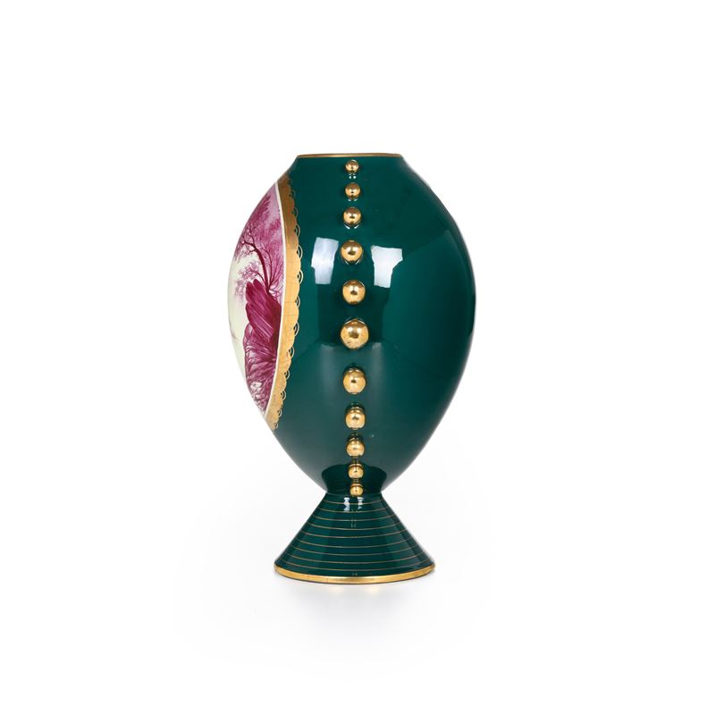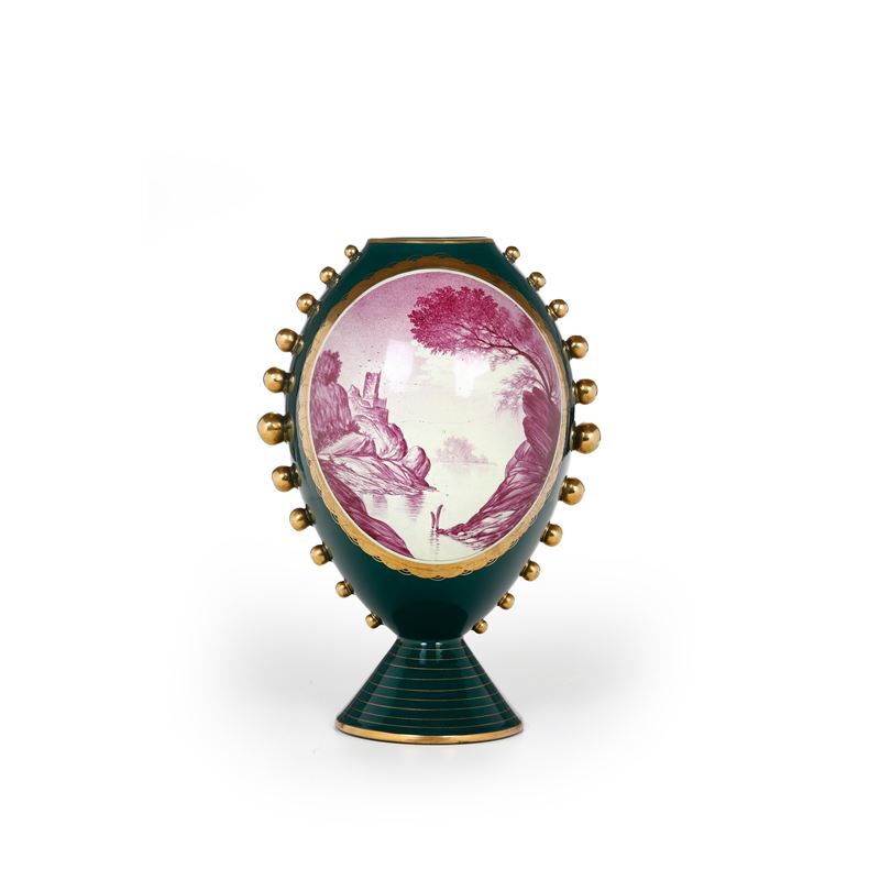Vaso globulare con riserva ovale in monocromia a paesaggio. Epoca Decò