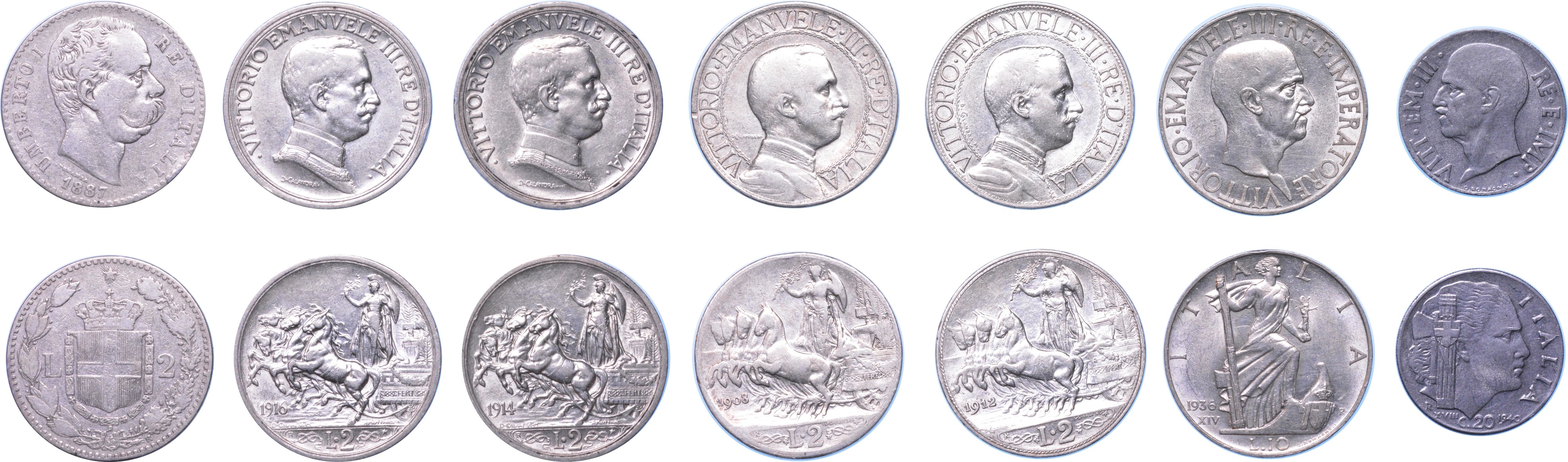Monetazione mista coniata durante i regni di Umberto e Vittorio Emanuele III di Savoia. Esemplari in argento e nichel. Conservazioni da MB a q.SPL.