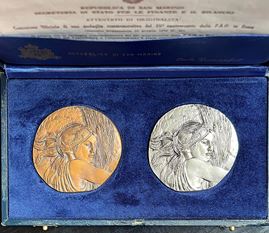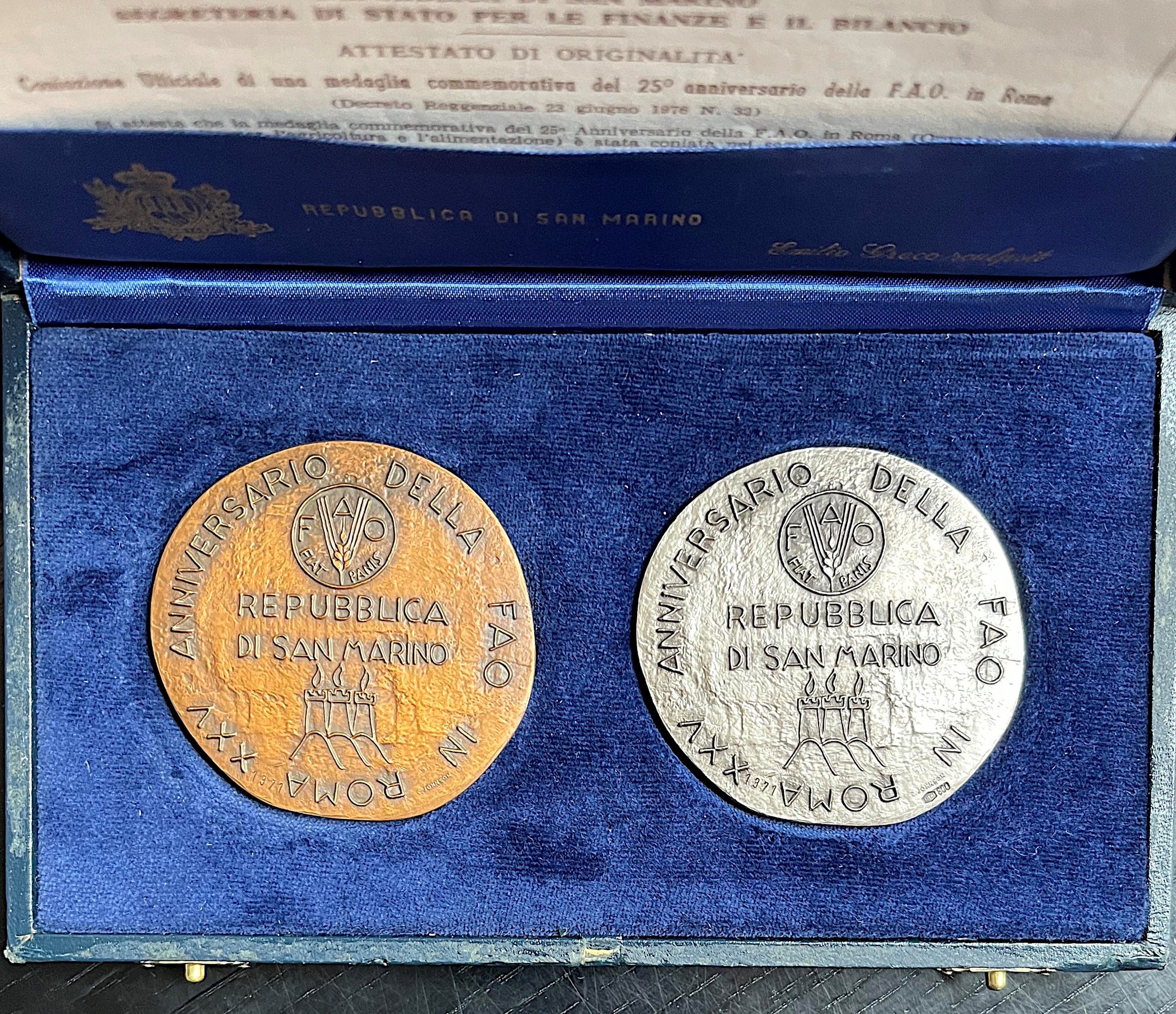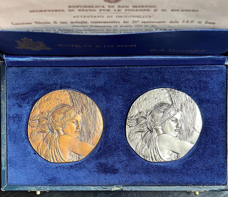 REPUBBLICA DI SAN MARINO. Dittico di medaglie in argento e bronzo celebrative del venticinquesimo anniversario della F.A.O., [..]