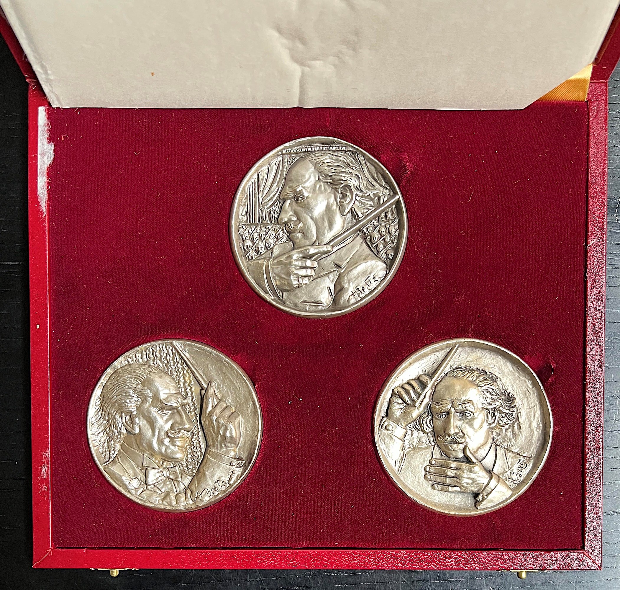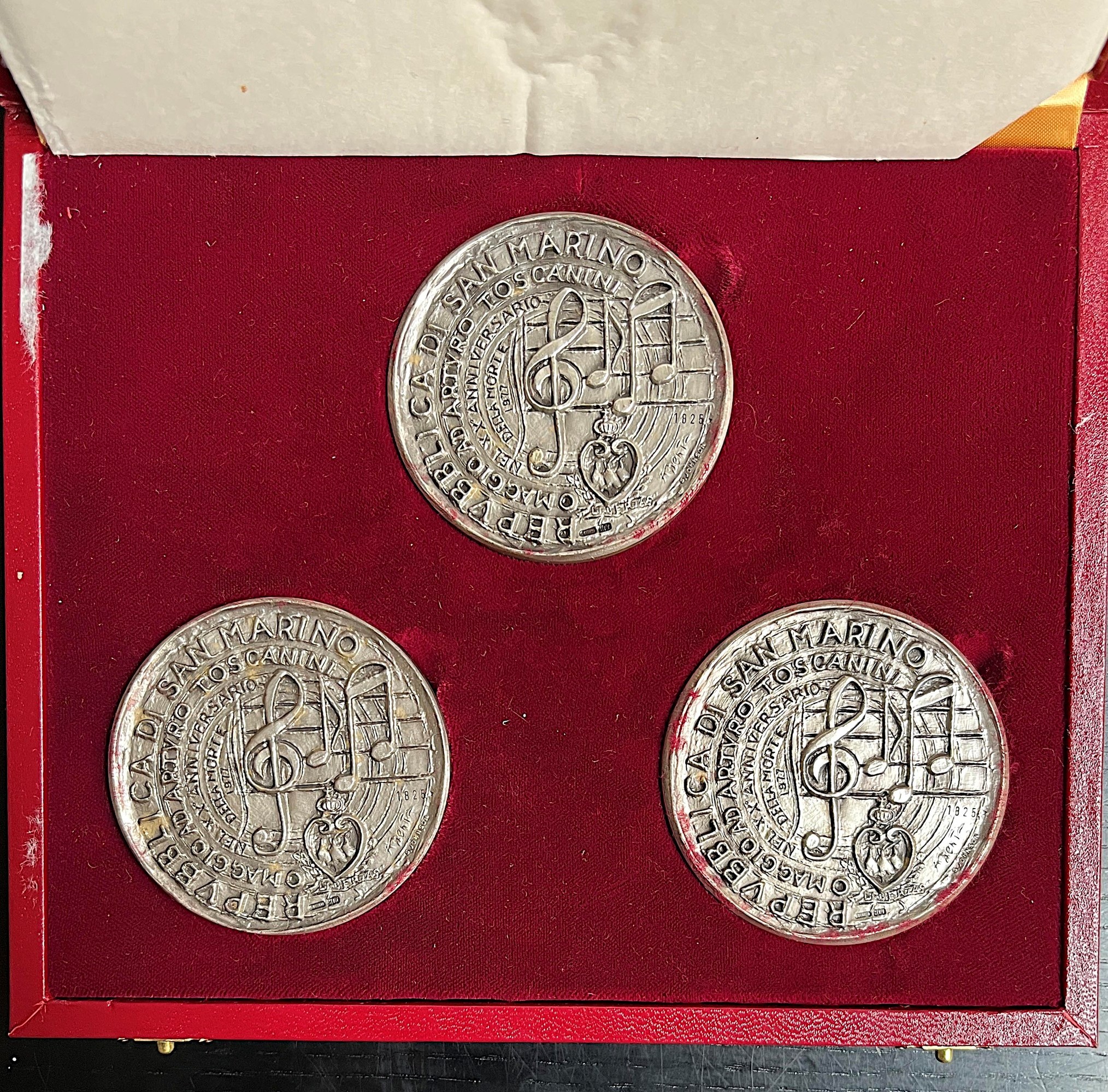 REPUBBLICA DI SAN MARINO. Trittico di medaglie in argento celebrative del ventesimo anniversario della morte di A. Toscanini, 1978.