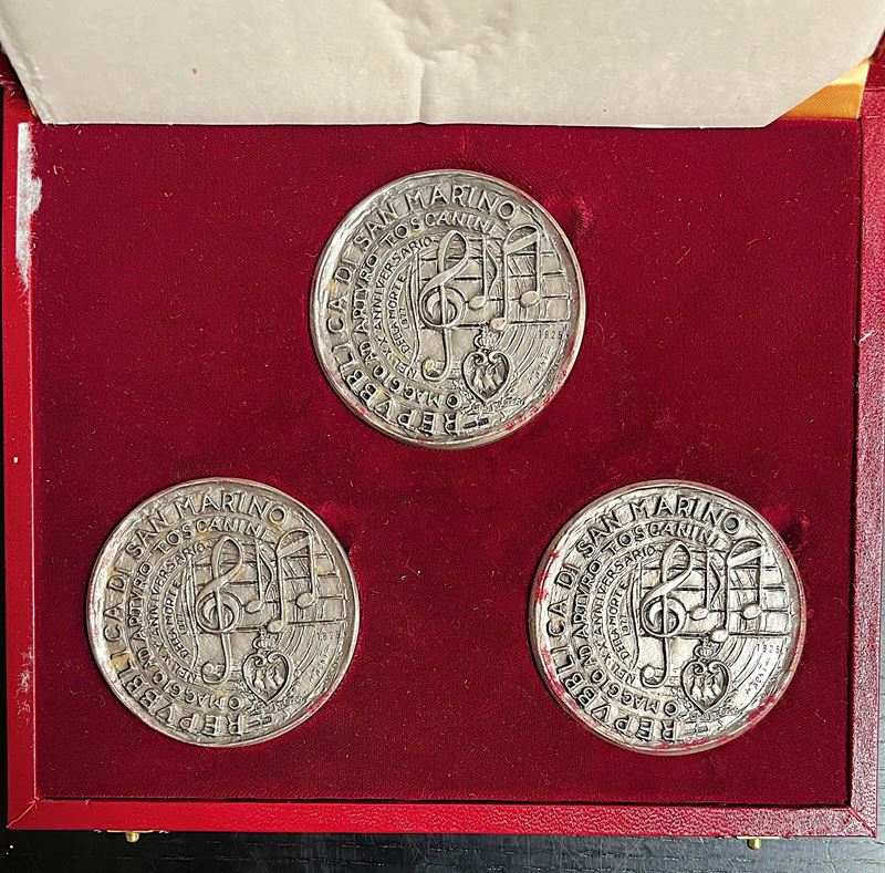 REPUBBLICA DI SAN MARINO. Trittico di medaglie in argento celebrative del ventesimo anniversario della morte di A. Toscanini, [..]