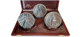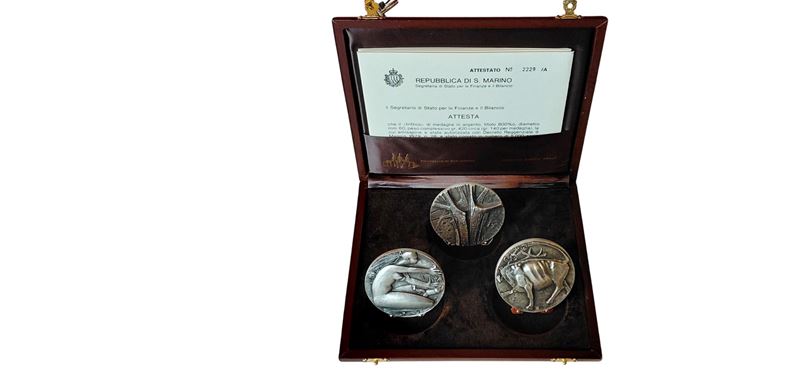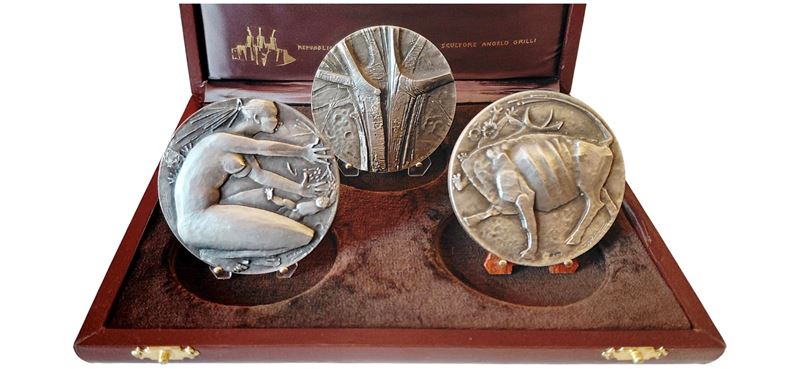 Trittico conservato in astuccio marrone in ottime condizioni complessive, completato dall’Attestato di Originalità cumulativo.1ª medaglia D.: volto di bimbo sui tre castelli piumati. V.: donna nuda genuflessa a dx con due bambini. 2ª medaglia D.: testa di toro sui tre castelli piumati. V.: toro a sx con due bambini. 3ª medaglia D.: tronchi sopra i tre castelli piumati. V.: tronco d’albero spaccato. Autore: Grilli (60 mm – Ag 800 ‰ - 420 gr. circa e tiratura 5.000 X 3). Da visionare.