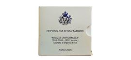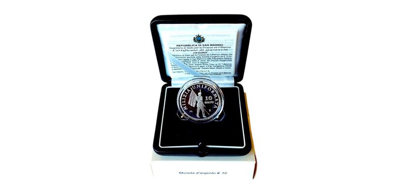 Lotto composto da una moneta da 10 Euro "Milizia Uniformata 1505 - 2005 (500° Anniversario)" Fondo Specchio in argento (925 ‰ - gr. 22), in confezione originale con Certificato di Garanzia, scatola in similpelle (leggermente segnata) e cartoncino esterno.