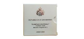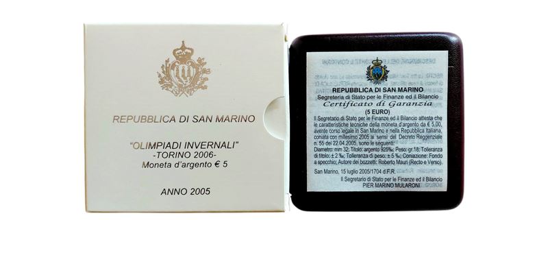 Lotto composto da una moneta da 5 Euro "Olimpiadi Invernali - Torino 2006 -" Fondo Specchio in argento (925 ‰ - gr. 18), in confezione originale con Certificato di Garanzia, scatola in similpelle (leggermente segnata) e cartoncino esterno.