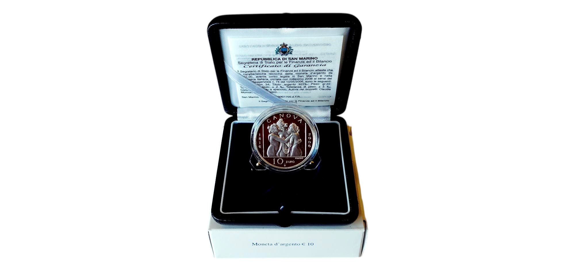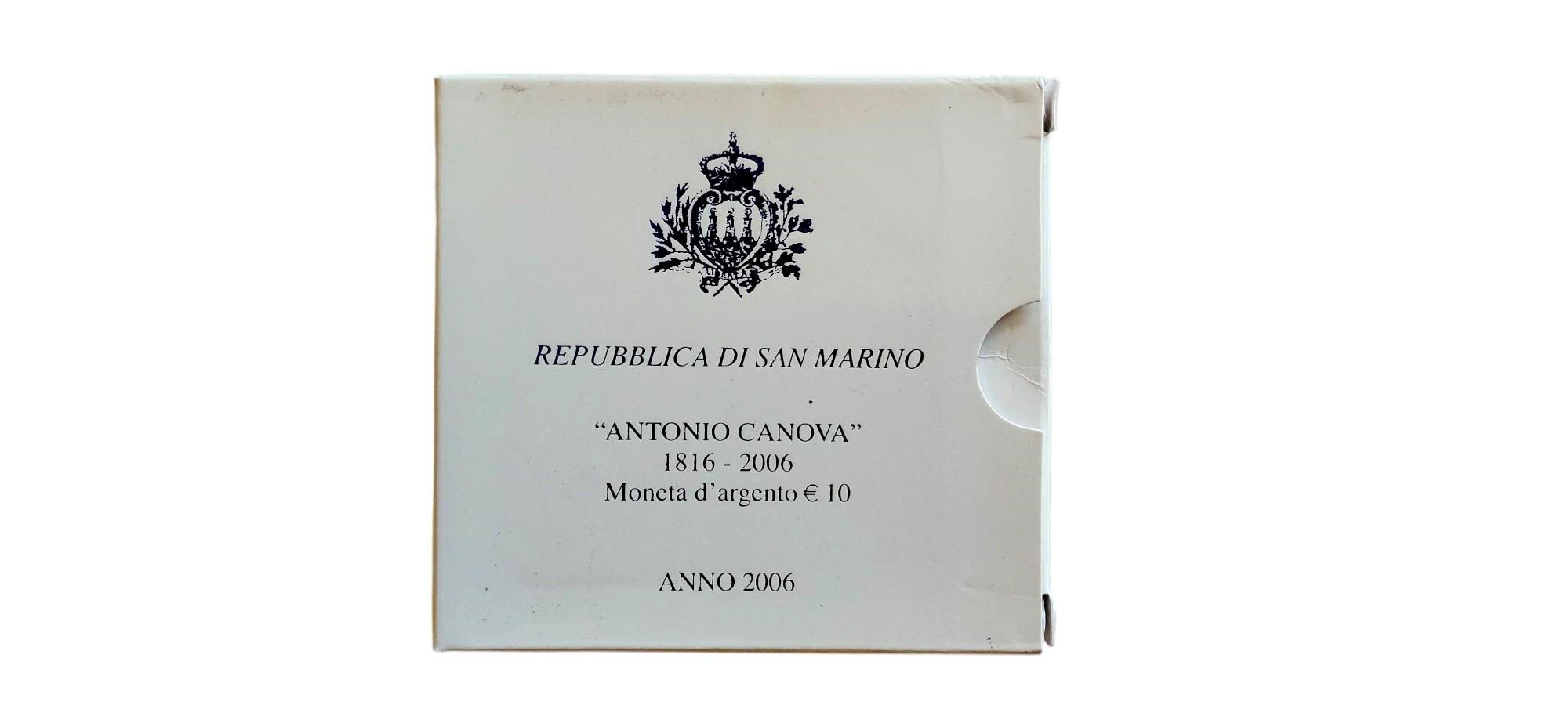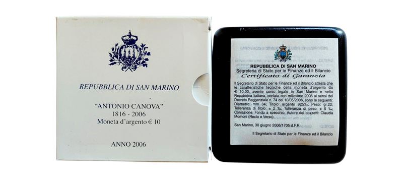 Lotto composto da una moneta da 10 Euro "Antonio Canova 1816-2006" Fondo Specchio in argento (925 ‰ - gr. 22), in confezione originale con Certificato di Garanzia, scatola in similpelle (leggermente segnata) e cartoncino esterno.