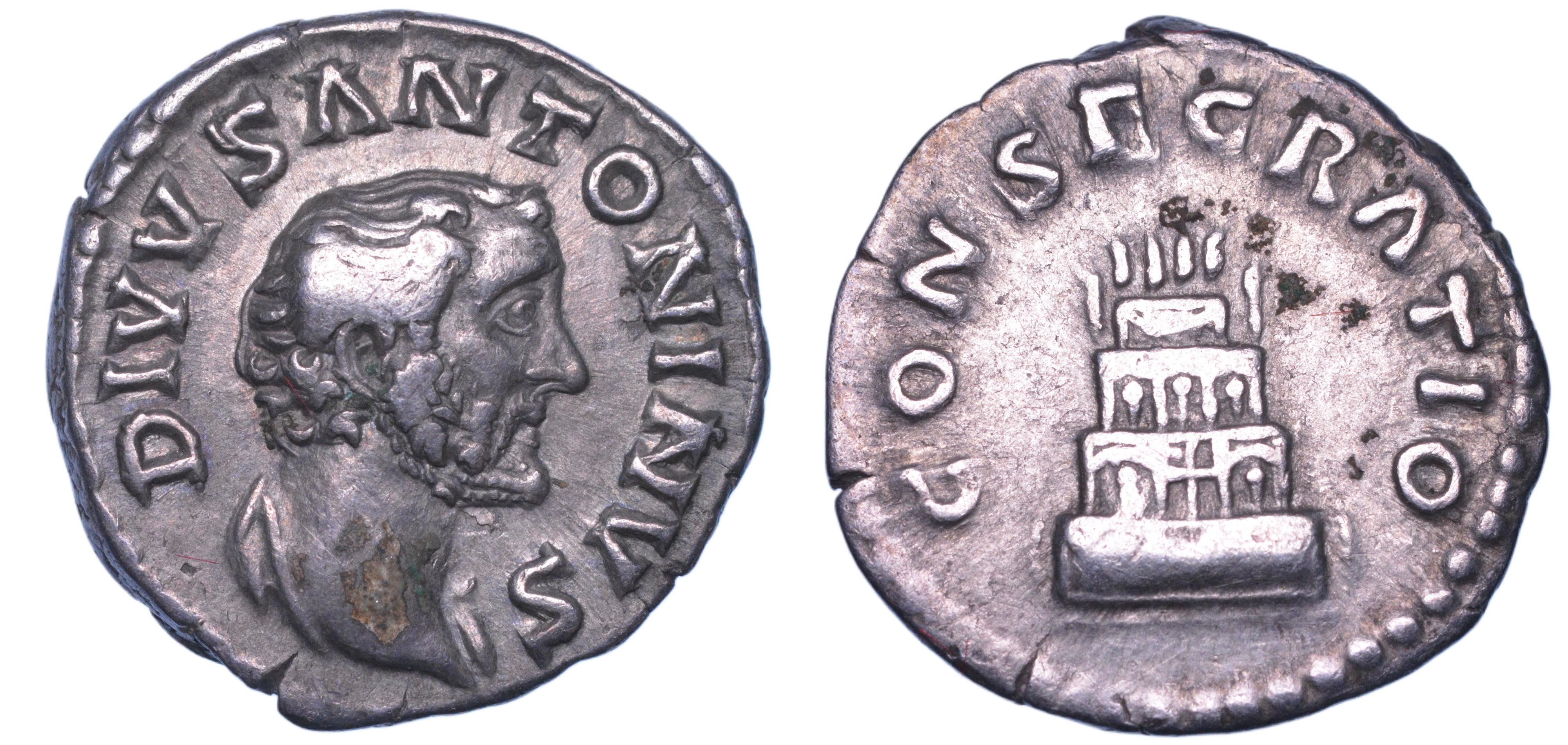 Testa a d. R/ Pira funeraria di quattro ordini decorata con ghirlande e sormontata da quadriga frontale. Coh. 164. RIC 436 (Aurelio). g. 3,09. diam. mm. 18,15. Arg. q.BB