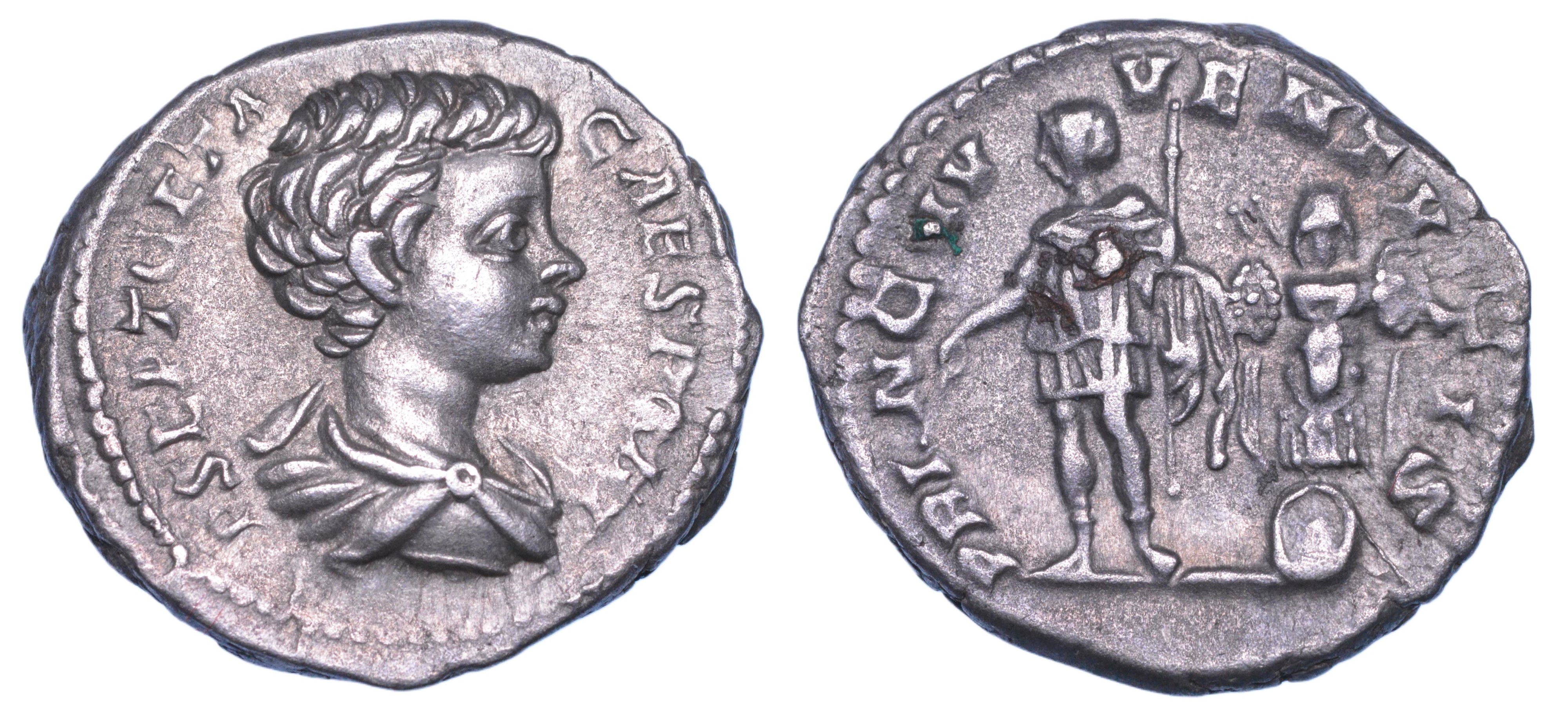 Busto drappeggiato a d. R/ Geta stante a s., in abiti militari, tiene ramo e scettro; dietro, trofeo. Coh. 157. RIC 18. g. 3,53. Diam. mm. 17,23. Arg. q.SPL