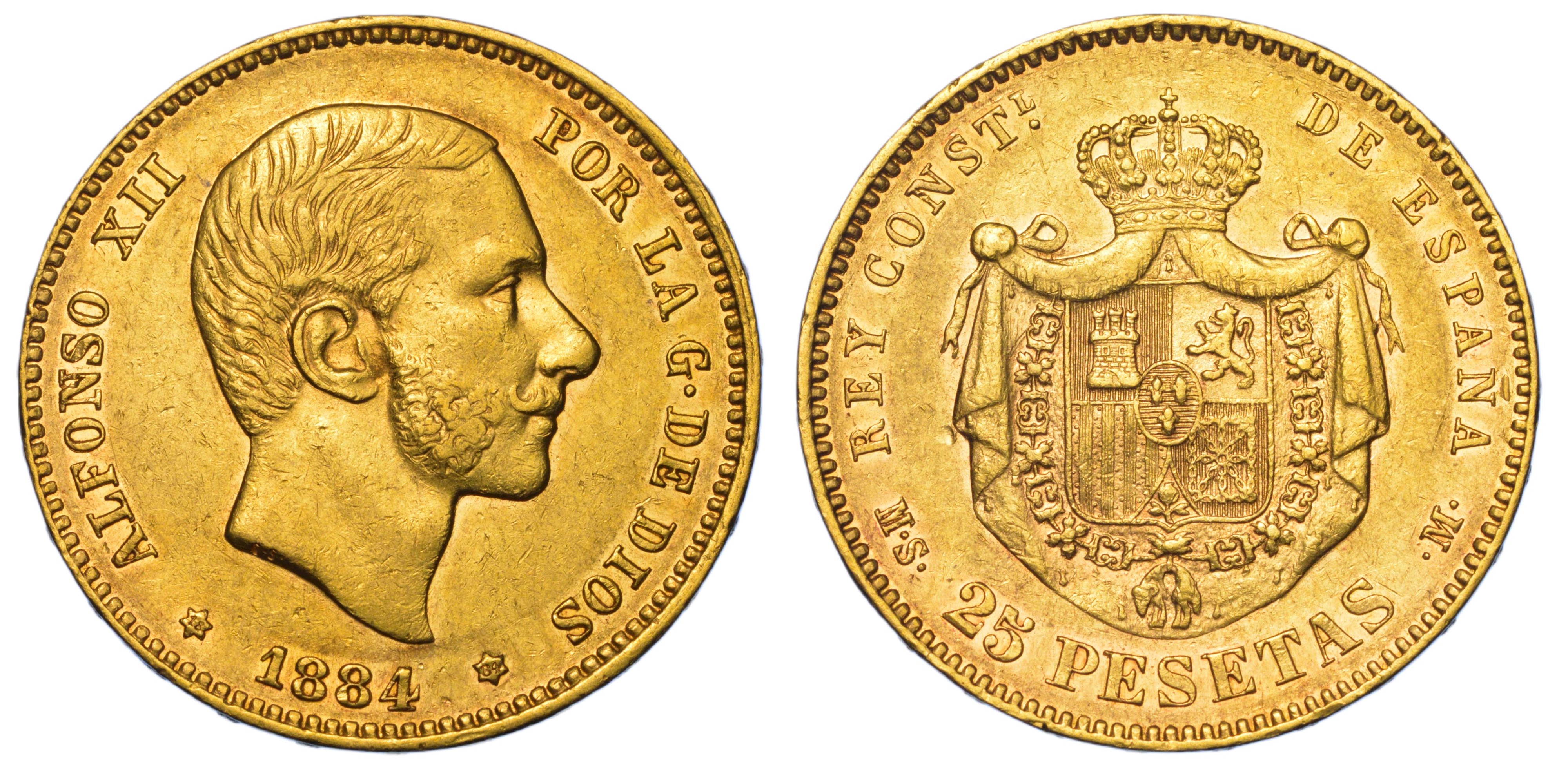 SPAGNA. ALFONSO XII, 1874-1885. 25 Pesetas 1884.