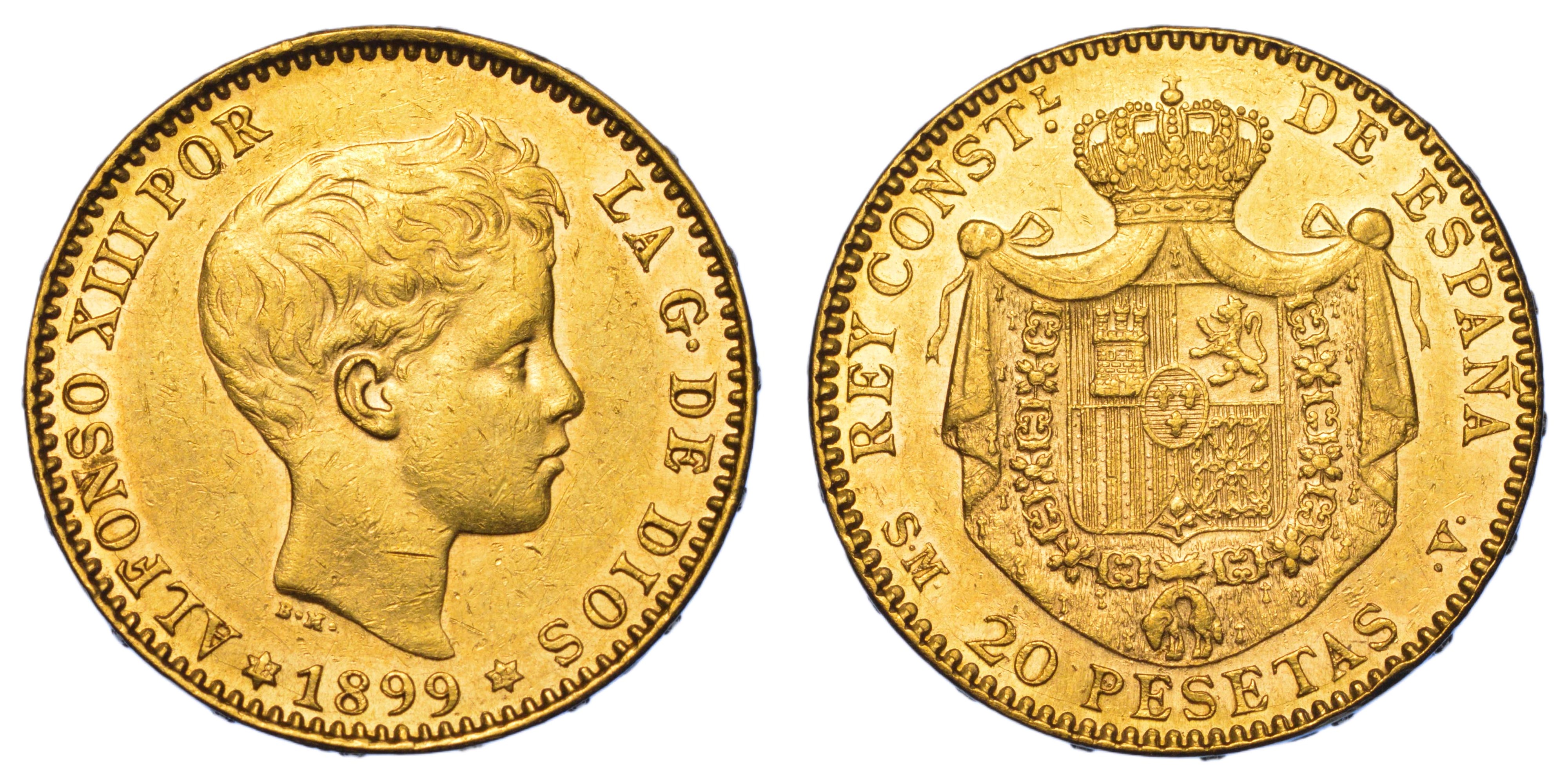 SPAGNA. ALFONSO XIII, 1885-1931. 20 Pesetas 1899.