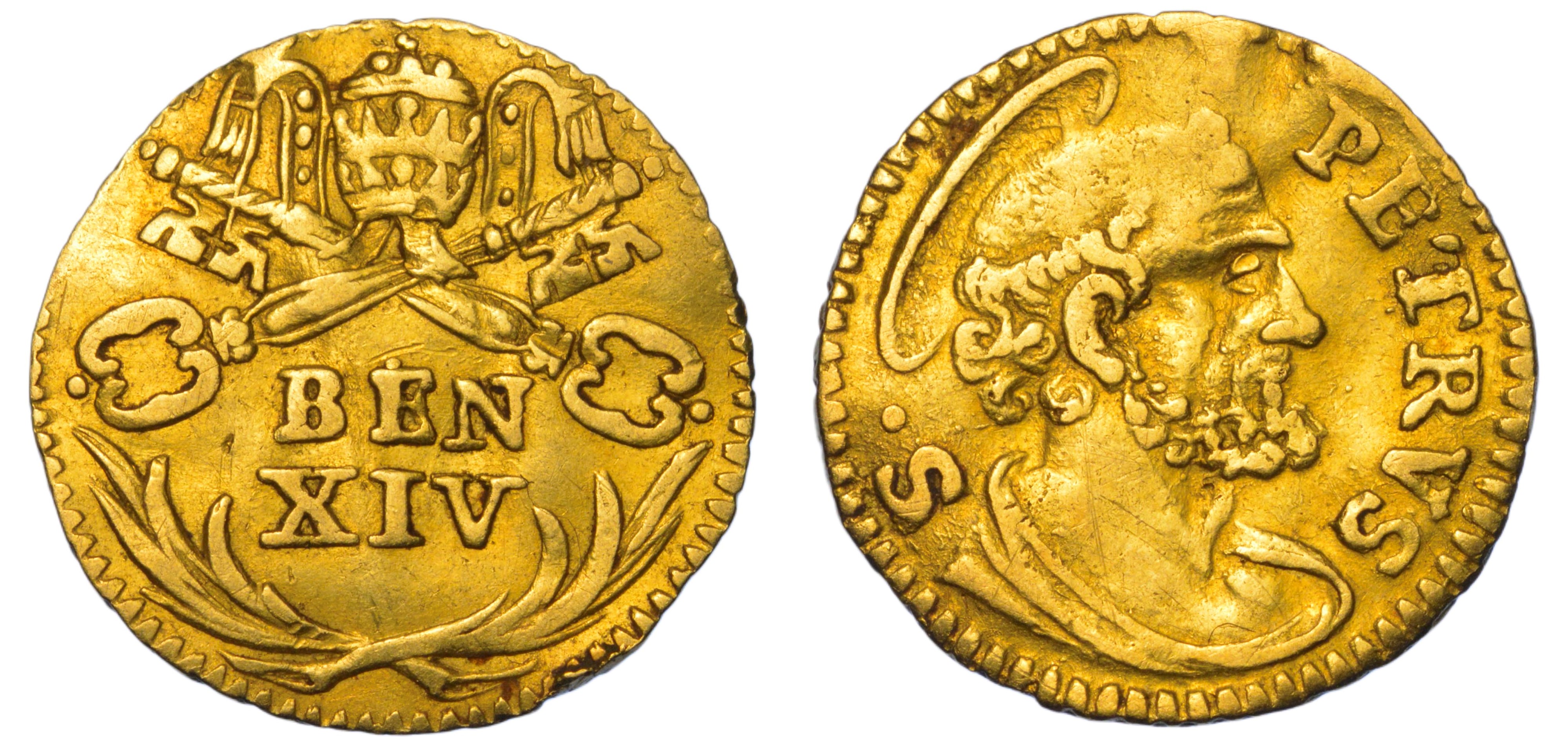 BEN XIV in due righe sormontato da chiavi decussate e triregno. R/ S PETRVS Busto nimbato di S. Pietro a d. Munt. 37. MIR 2594/11. Raro. g. 0,84. Diam. mm. 12,92. Oro. q.BB
