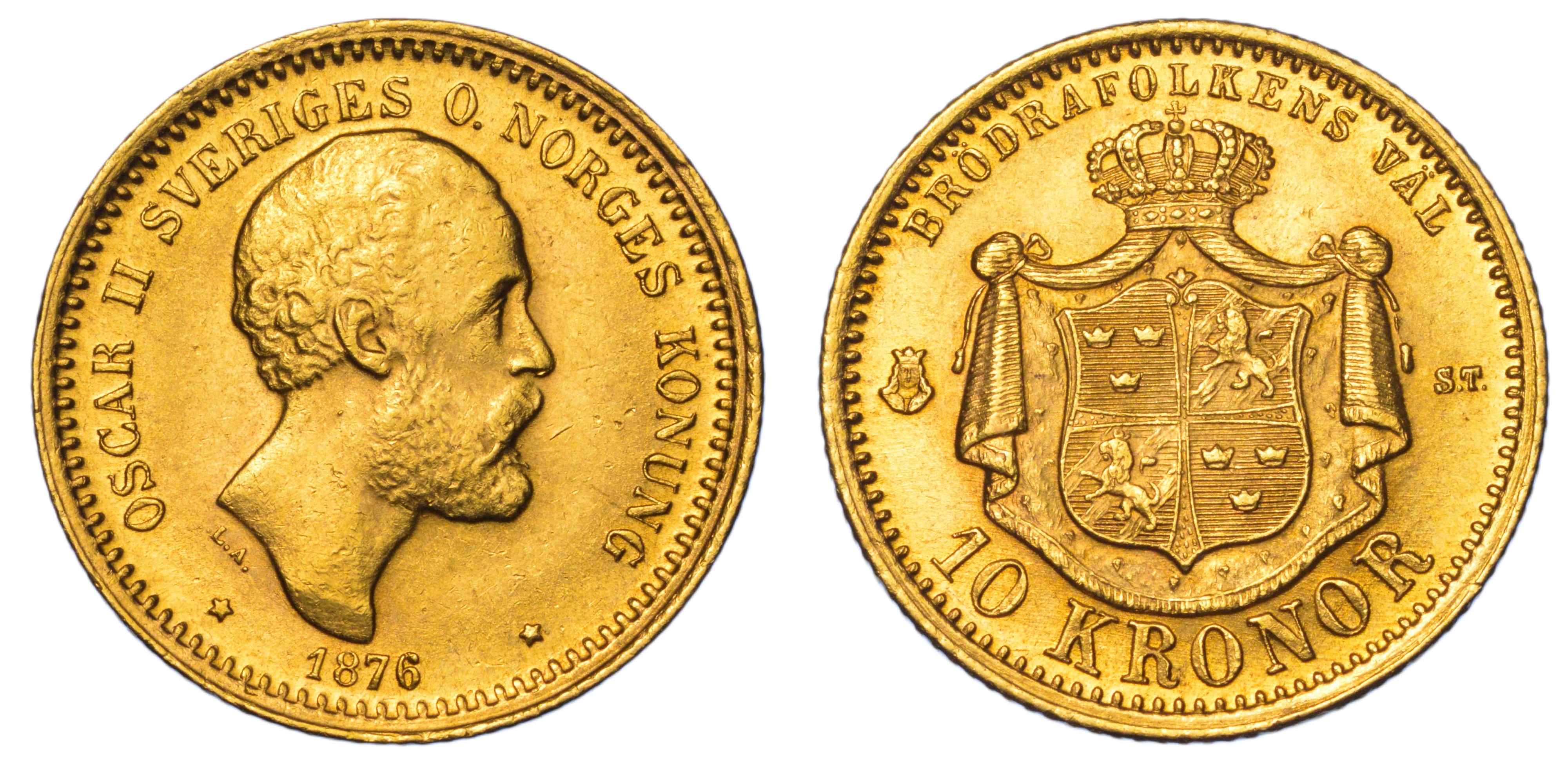 SVEZIA. OSKAR II, 1872-1907. 10 Kronor 1876.