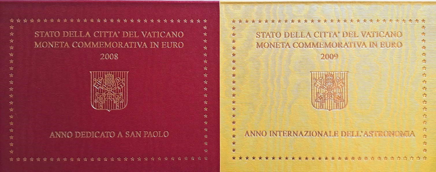Vaticano 2008 e 2009 - 2 X 2 Euro commemorativi FdC: "Anno Paolino" e "Anno dell'Astronomia" in folder.