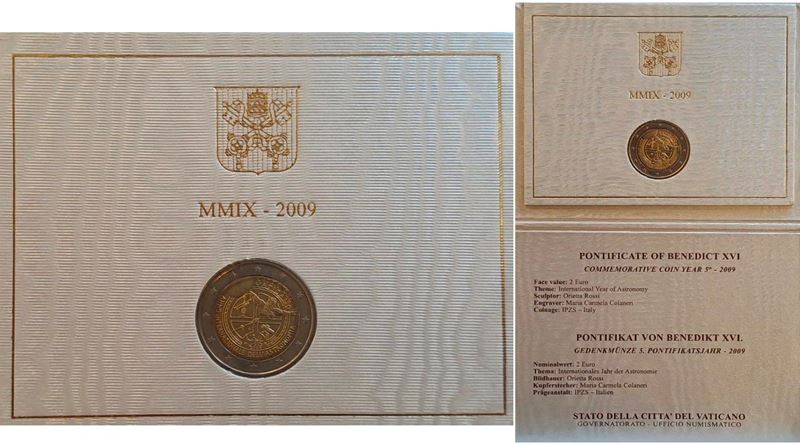 Lotto composto da 2 monete da 2 € commemorativi FdC 2008 e 2009 emesse dal Vaticano, complete di folder. Le confezioni e le monete si presentano in condizioni da non perdere. Zecca: Roma. (1° lotto).