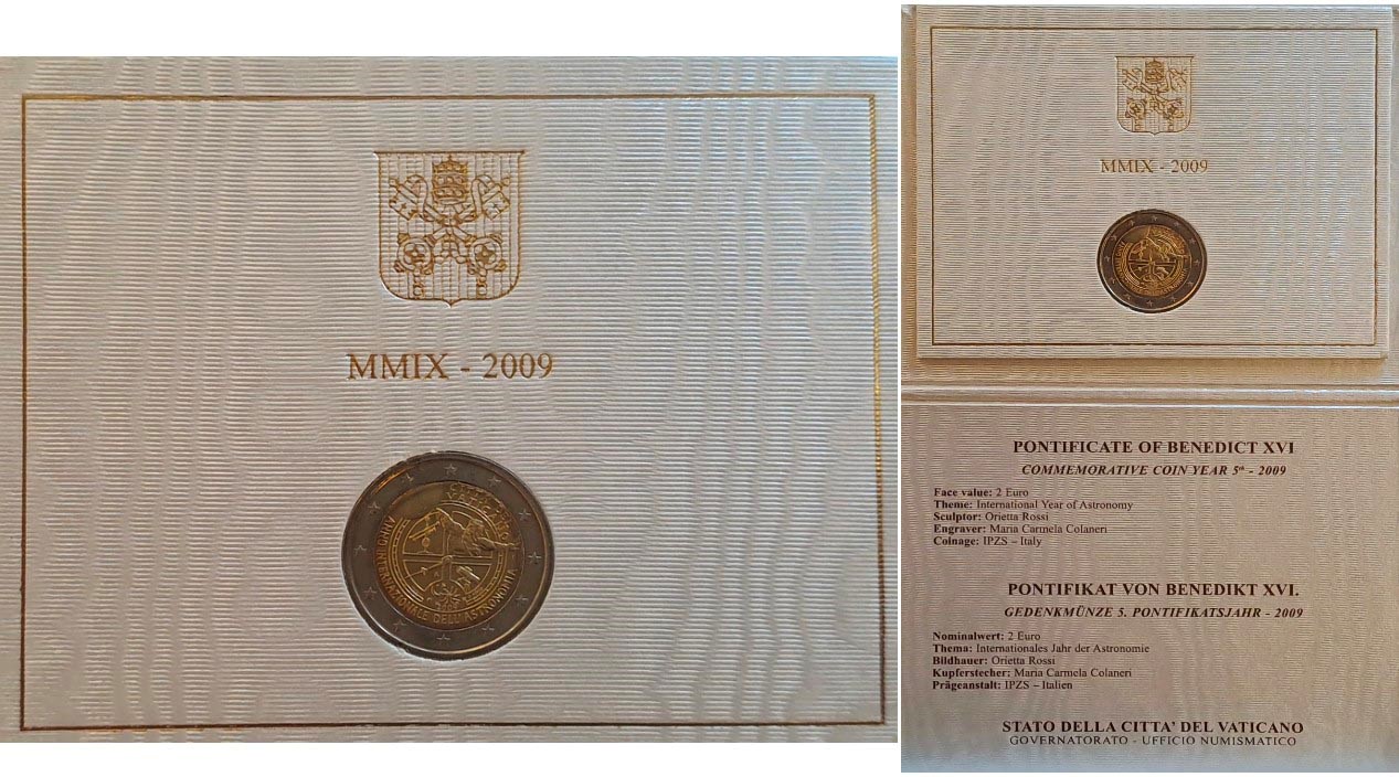 Vaticano 2008 e 2009 - 2 X 2 Euro commemorativi FdC: "Anno Paolino" e "Anno dell'Astronomia" in folder.