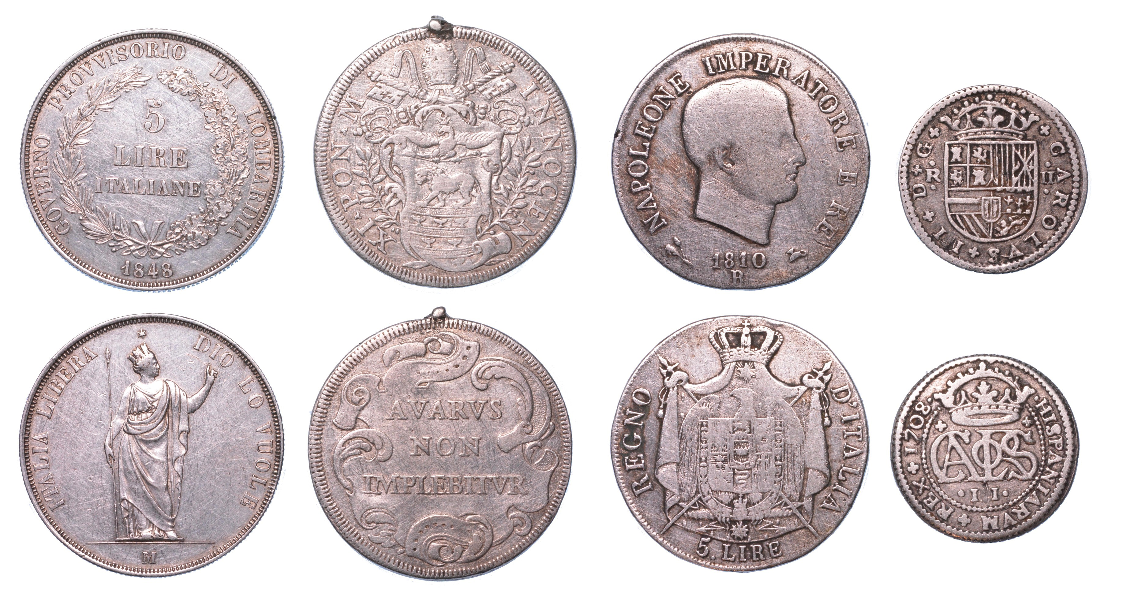BOLOGNA. NAPOLEONE I, 1805-1814. 5 Lire 1810. Gig. 101. g. 24,32. Arg. Graffi da pesante pulizia. B/MB - MILANO. GOVERNO PROVVISORIO DI LOMBARDIA, 1848. 5 Lire 1848. Gig. 3. g. 24,90. Arg. Graffi da pesante pulizia. MB/q.BB - ROMA. INNOCENZO XI,1676-1689. Mezza Piastra. Munt. 53. g. 15,67. Arg. Graffi da pesante pulizia. Appiccagnolo. MB/q.BB - SPAGNA. CARLO III DI SPAGNA, 1701-1714. 2 Reales 1708. Cal. 29. g. 4,64. Arg. Abrasioni che parrebbero volontarie sulle stanghette centrali di Carlo III. Graffi da pulizia. MB/BB