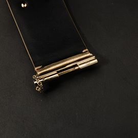 In pelle dorata con scaglie e logo.