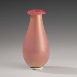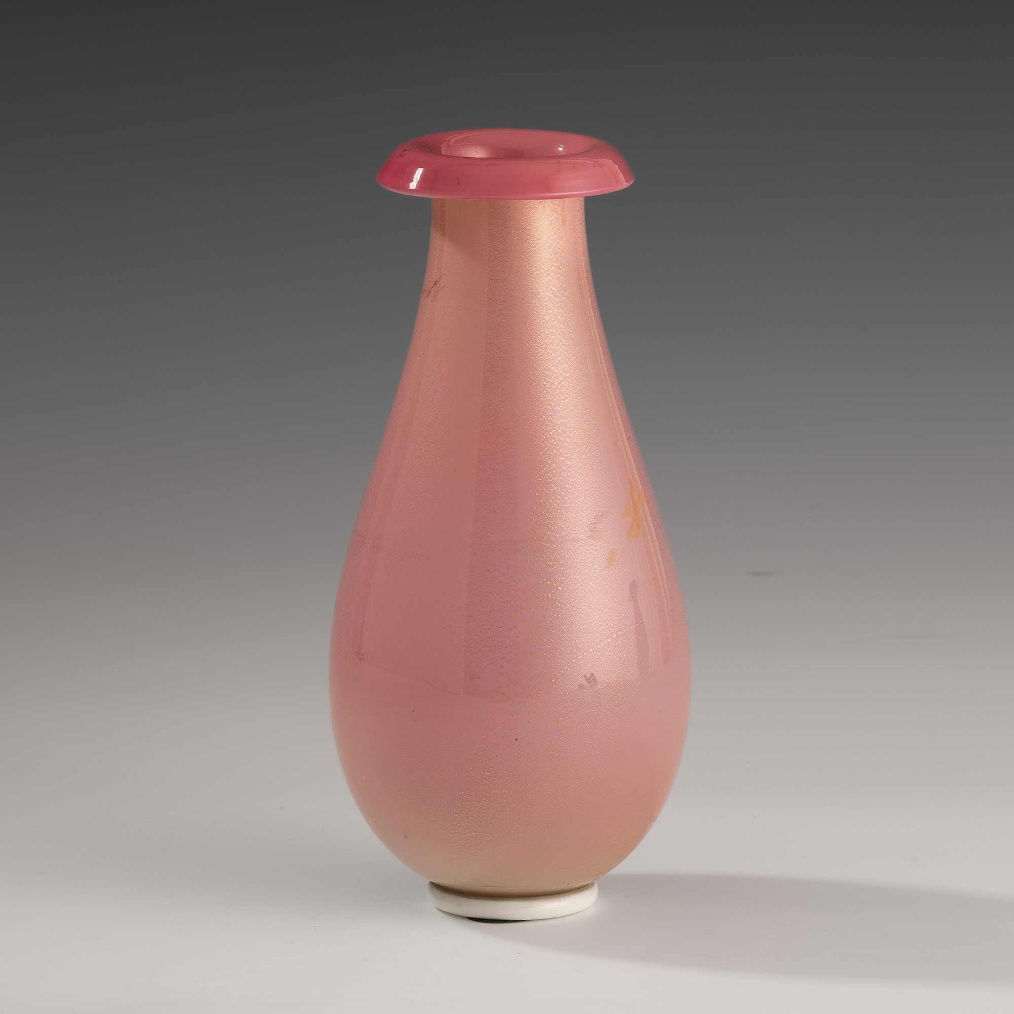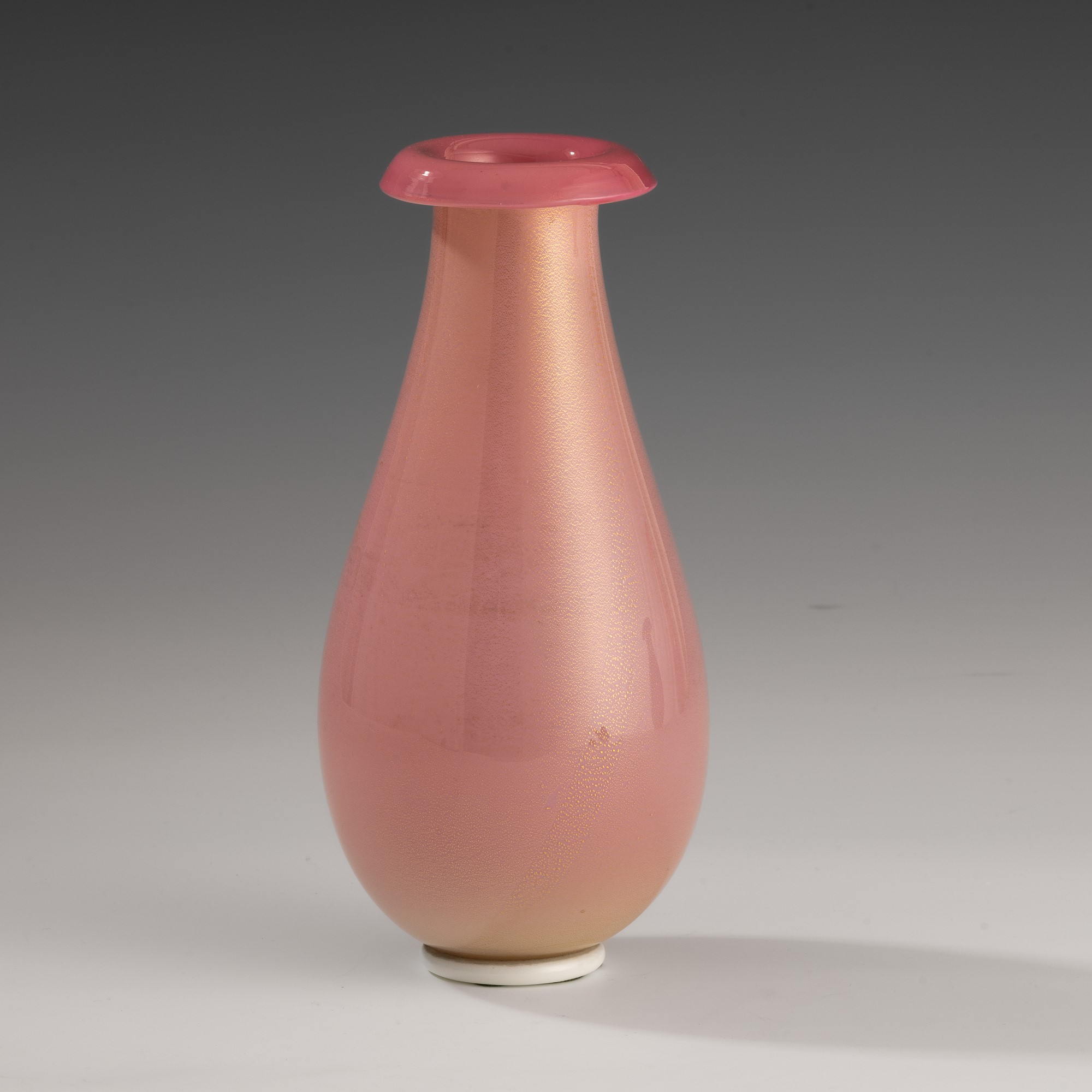 Drop-shaped vase with flared mouth in cyclamen incamiciato blown glass with gold leaf decoration. Applied lattimo foot.