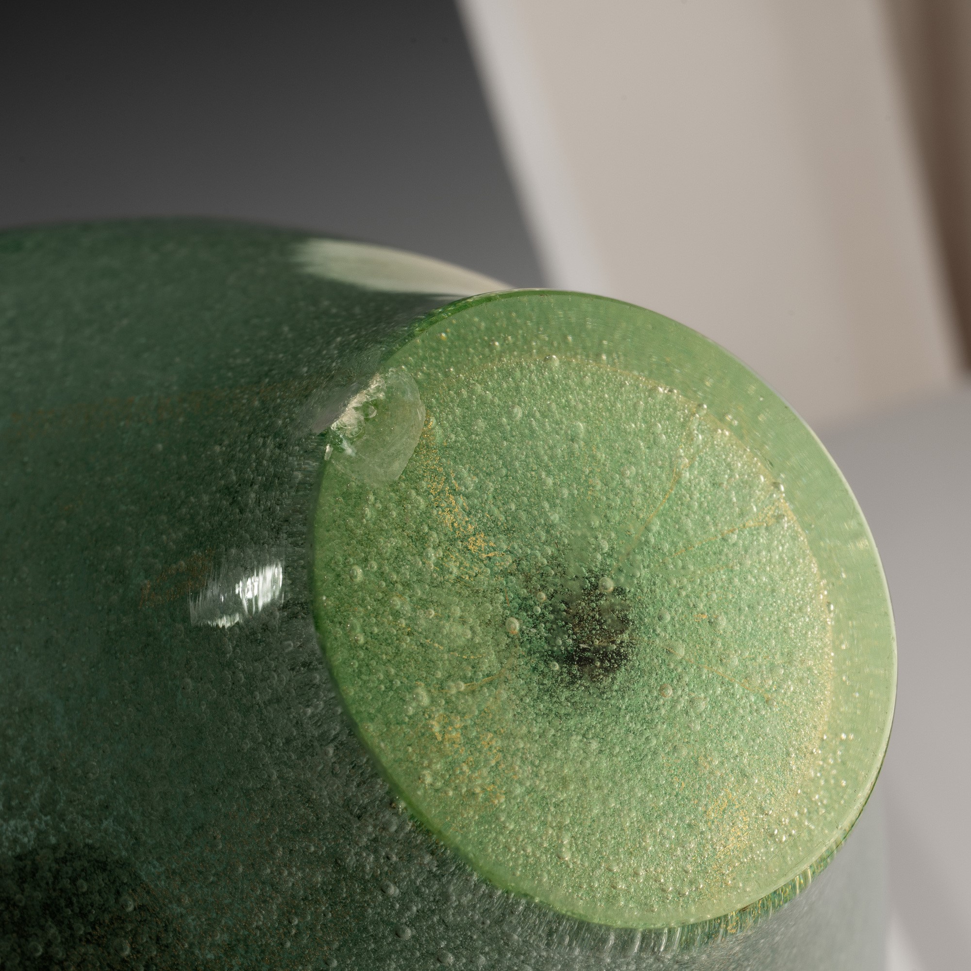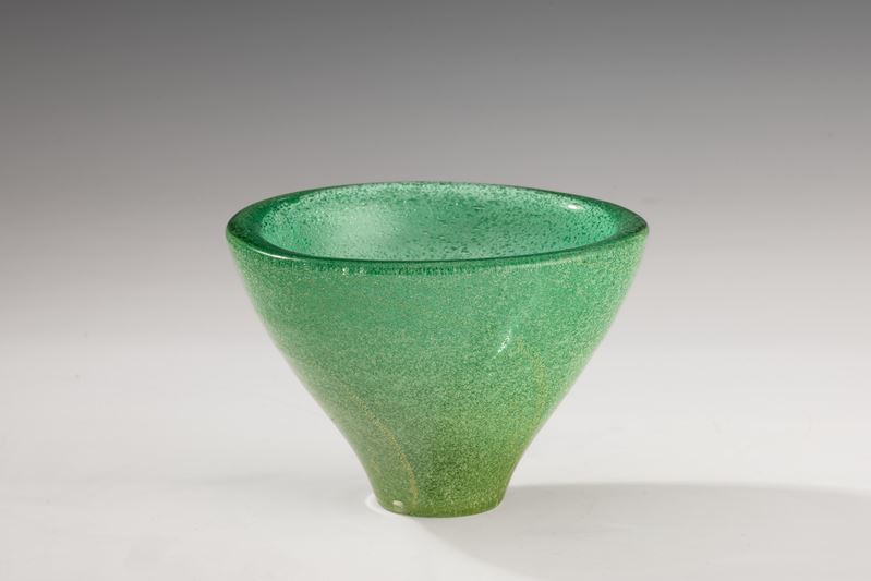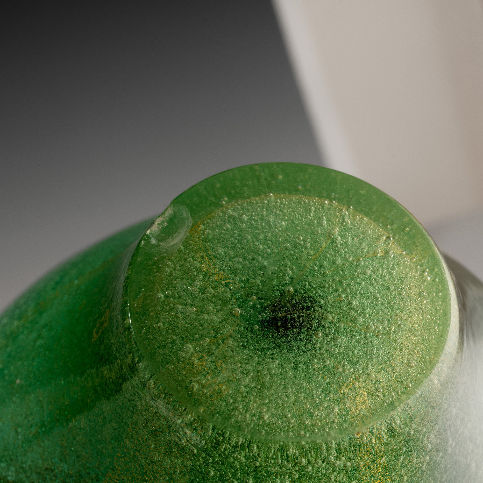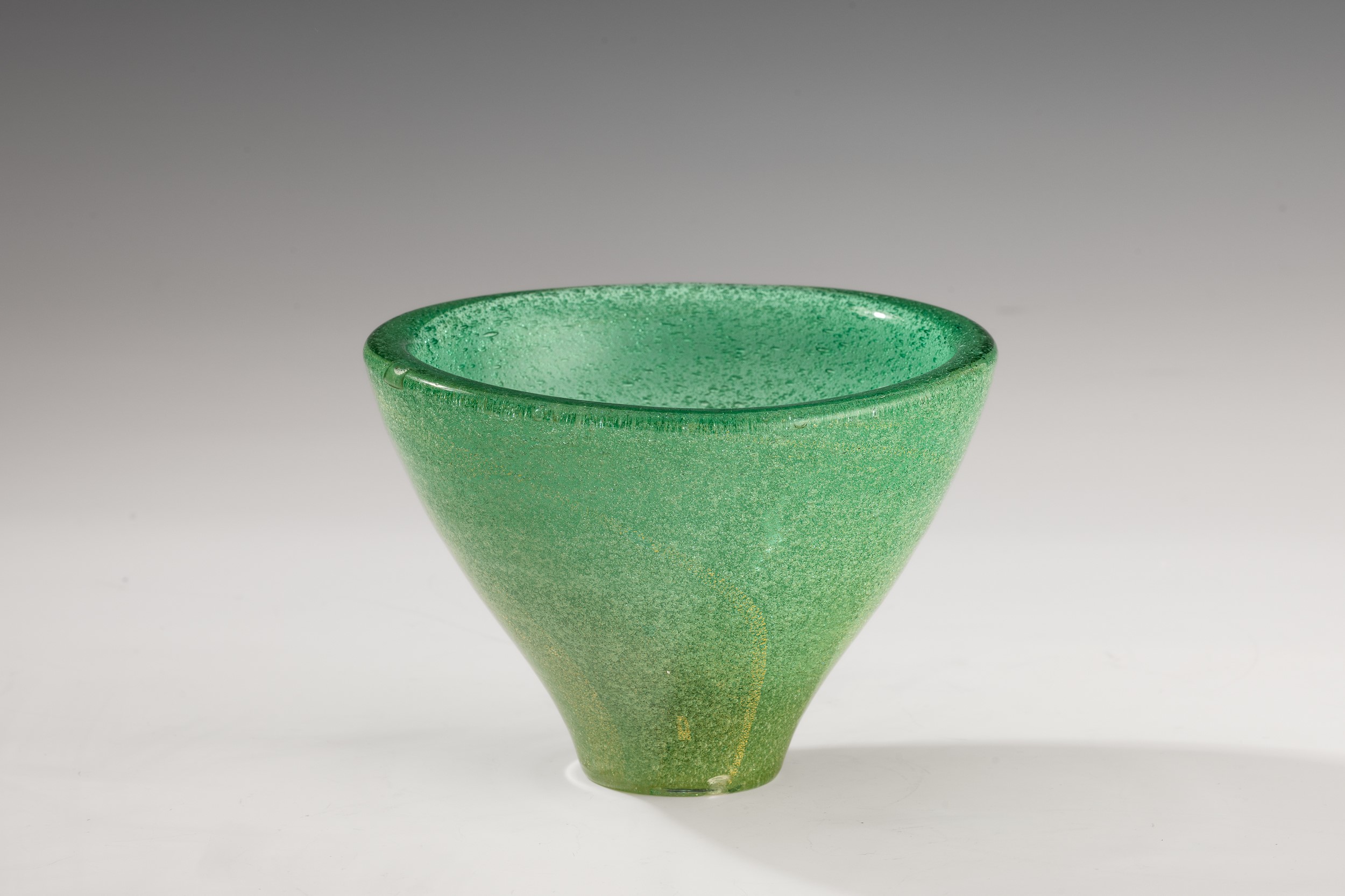 Truncated-conical vase in sommerso jade green A Bollicine glass with gold leaf inclusion. Acid-etched signature “Venini Murano".