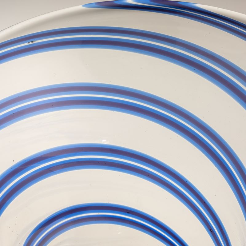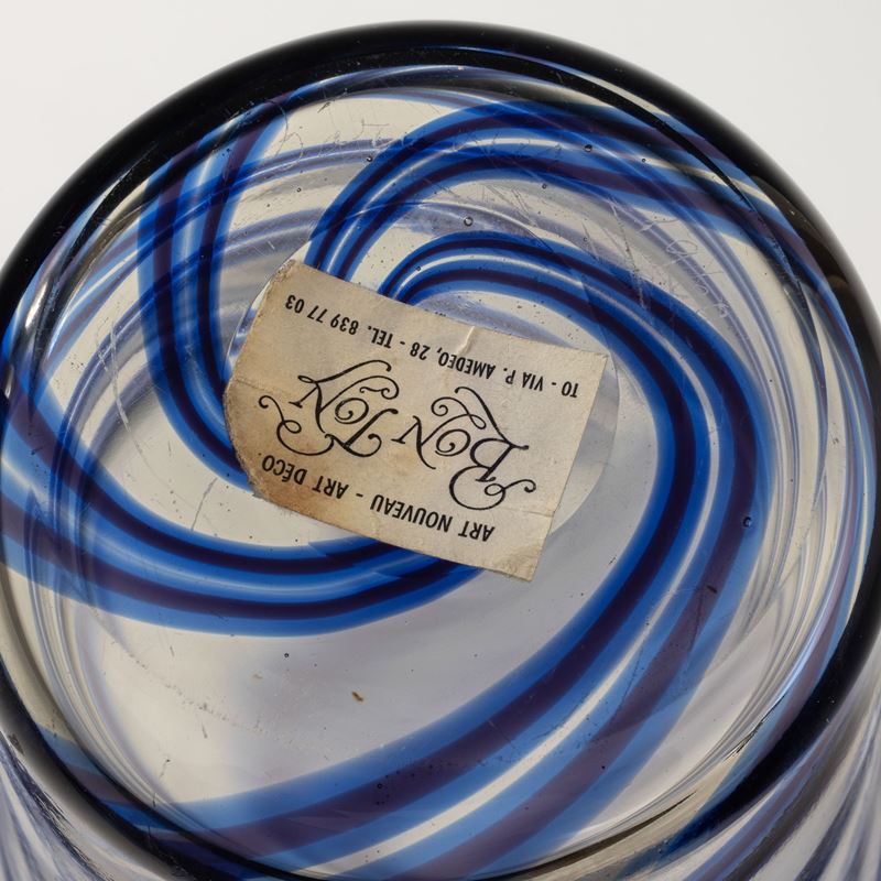 Large bell-shaped vase in blown glass with decoration of twisted polychrome canes. Etched signature “Barovier 1960" and old dealer label.