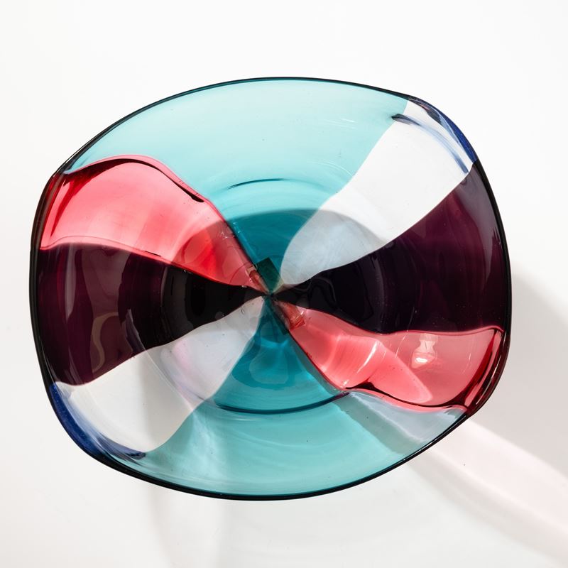 Spicchi series bowl in blown glass with decoration of bands in talpa, rosato, uva and acquamarina.