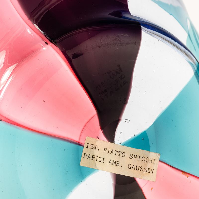 Acid-etched signature “Venini Murano Italia" and paper label from the collection.