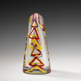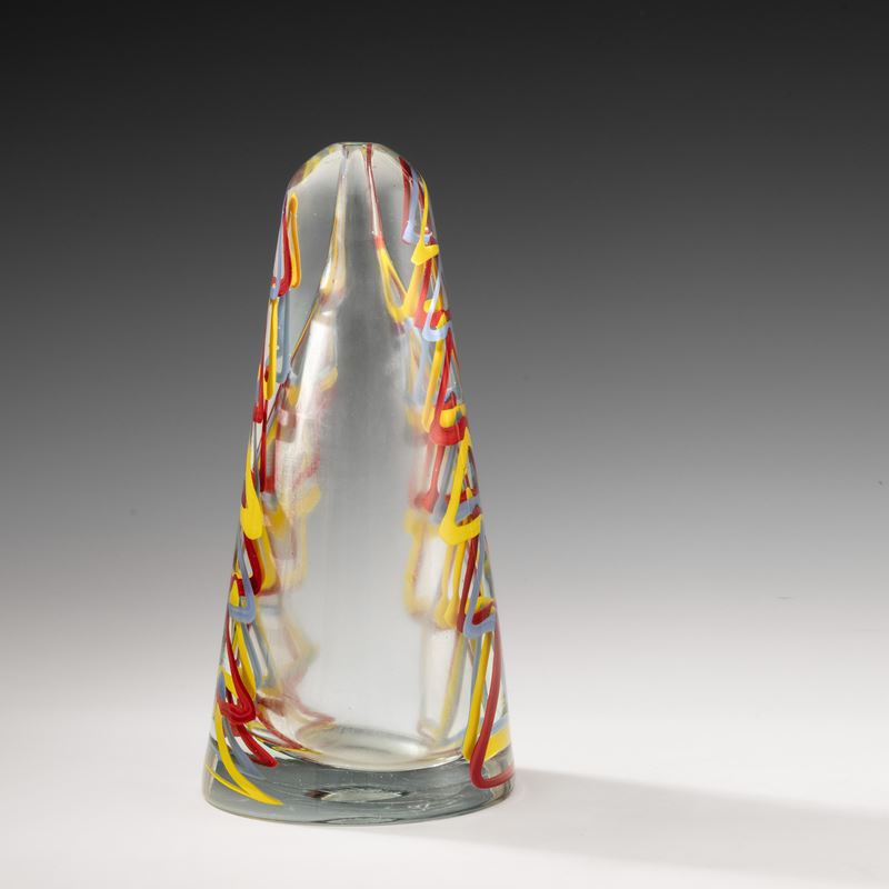 Obelisk-shaped vase in heavy transparent glass with submerged abstract decoration of polychrome canes.