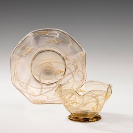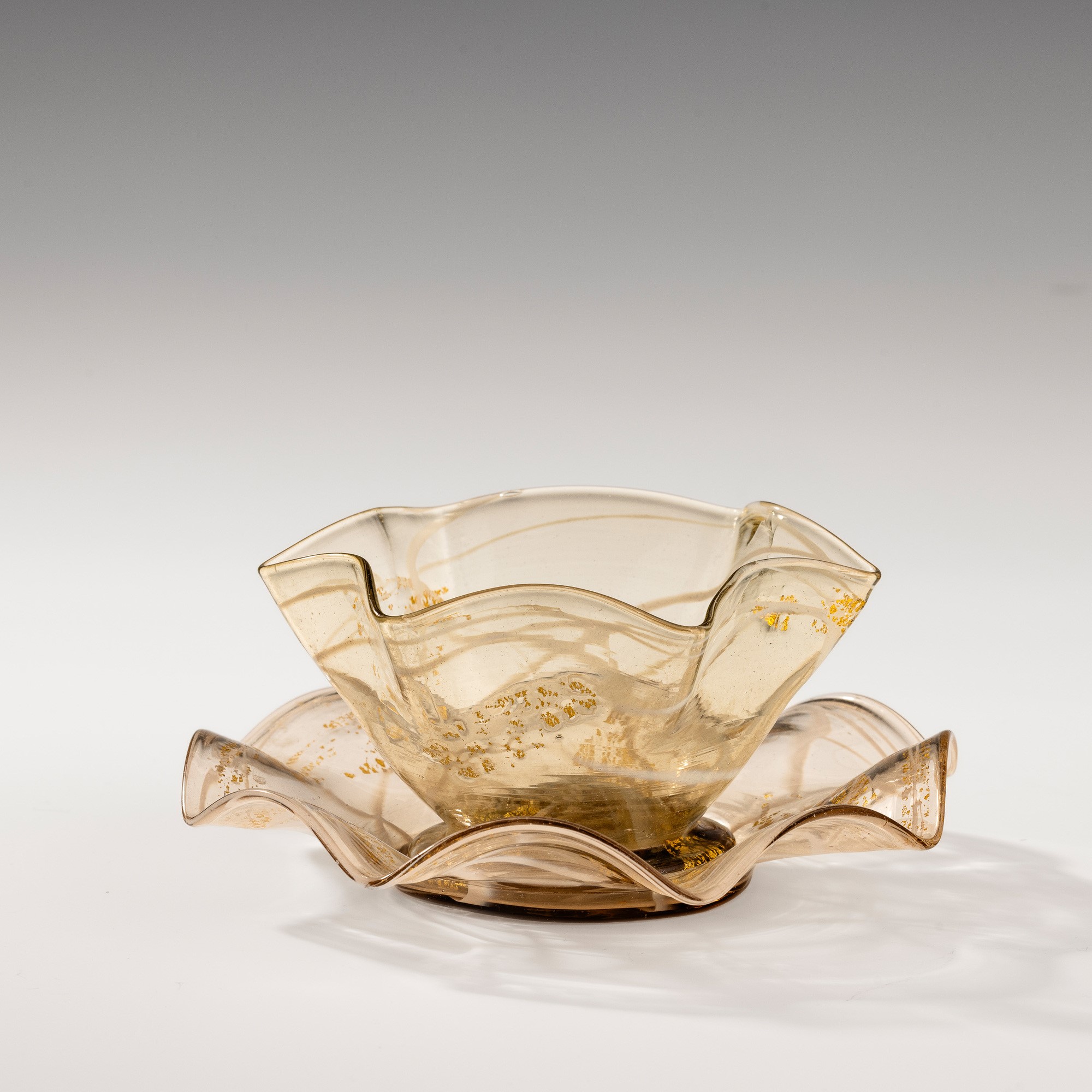 Hexagonal finger bowl on circular foot with shaped underplate in fumé blown glass with applied lattimo threads and inclusion of gold leaf.