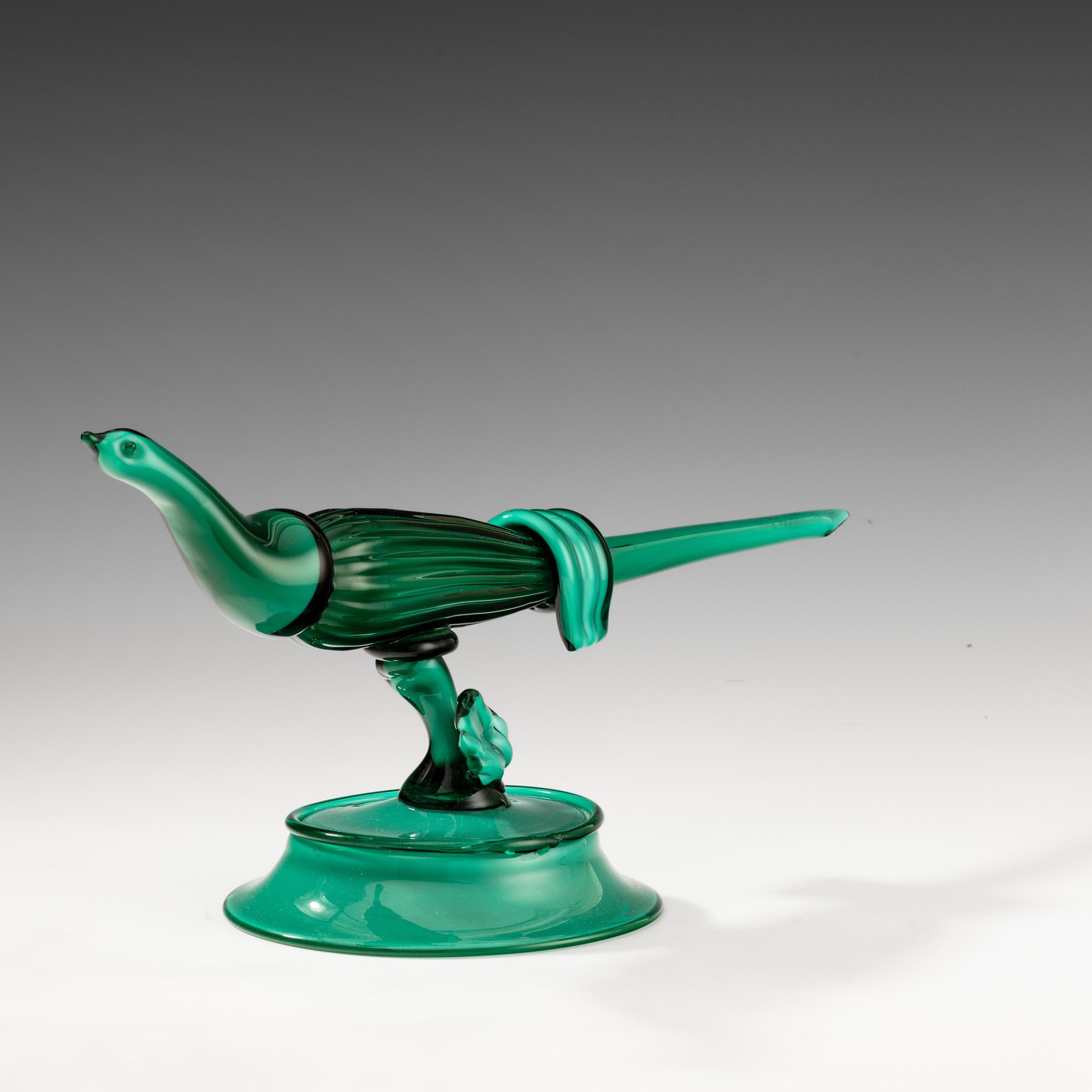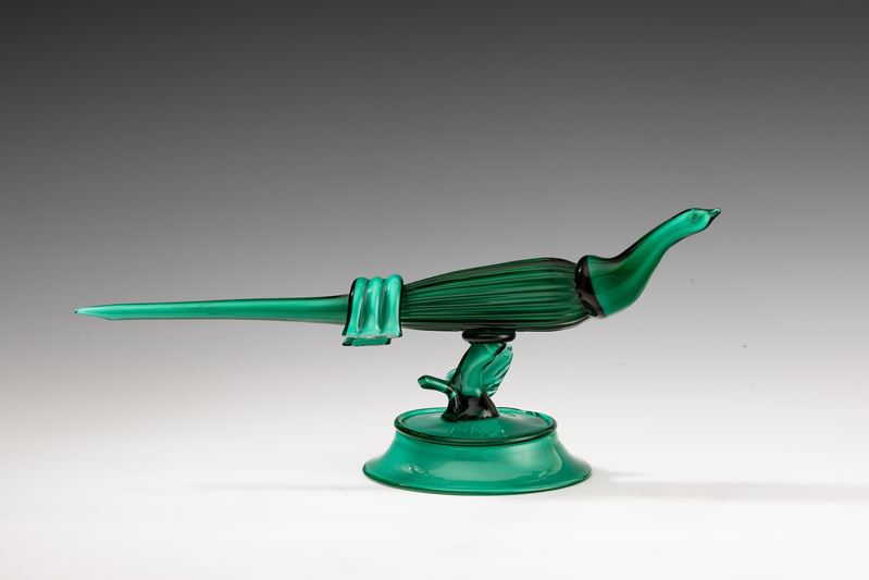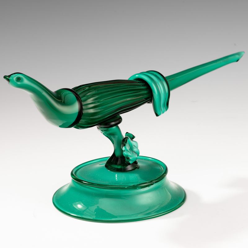 Sculpture depicting a pheasant in emerald green cased opaline glass on bell-shaped base. Replica made in the 1980s from an original 1930 model.