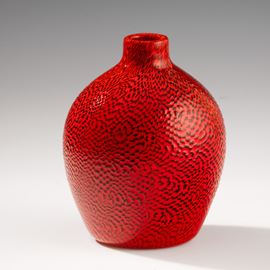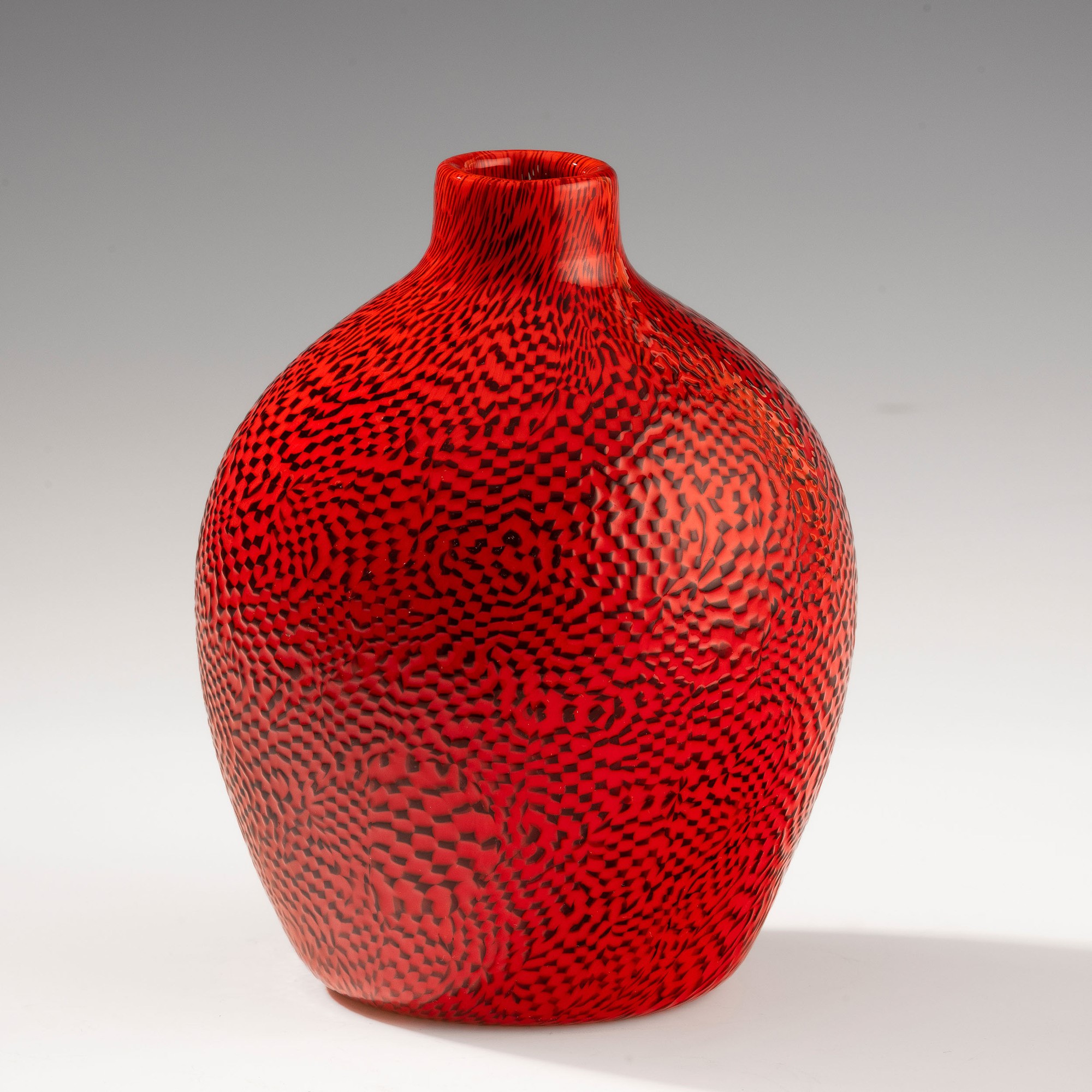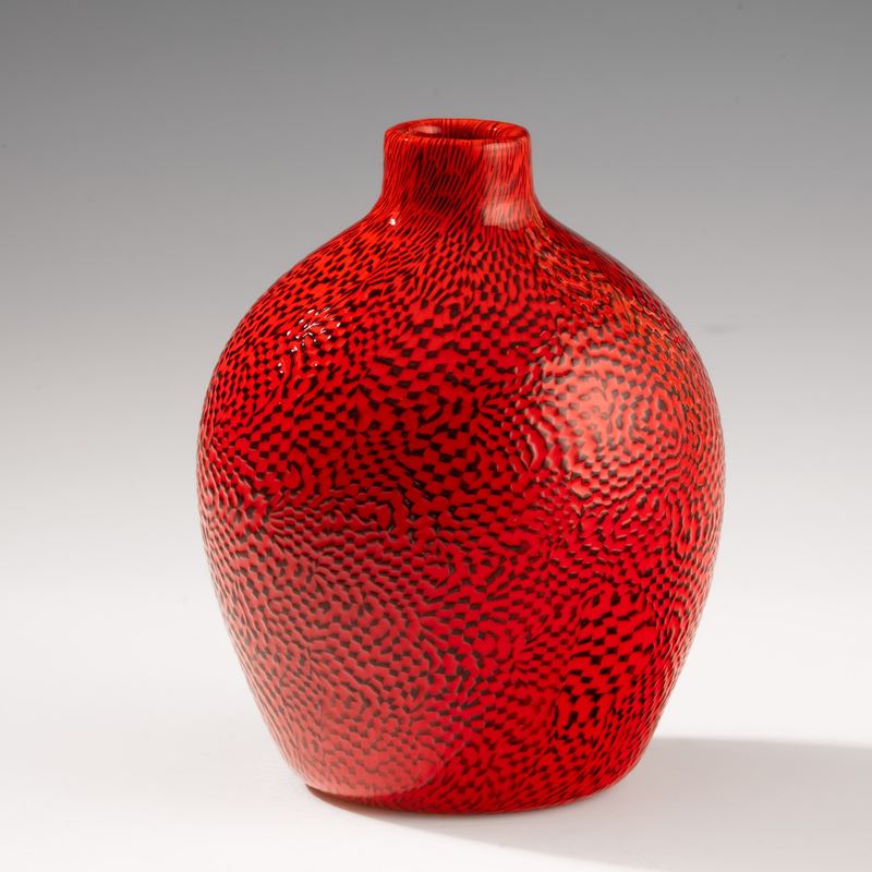 Rare globular vase with small neck in blown glass decorated with A Dame murrine in coral and black. Acid-etched signature “Venini Murano Italia".