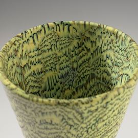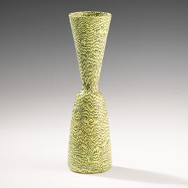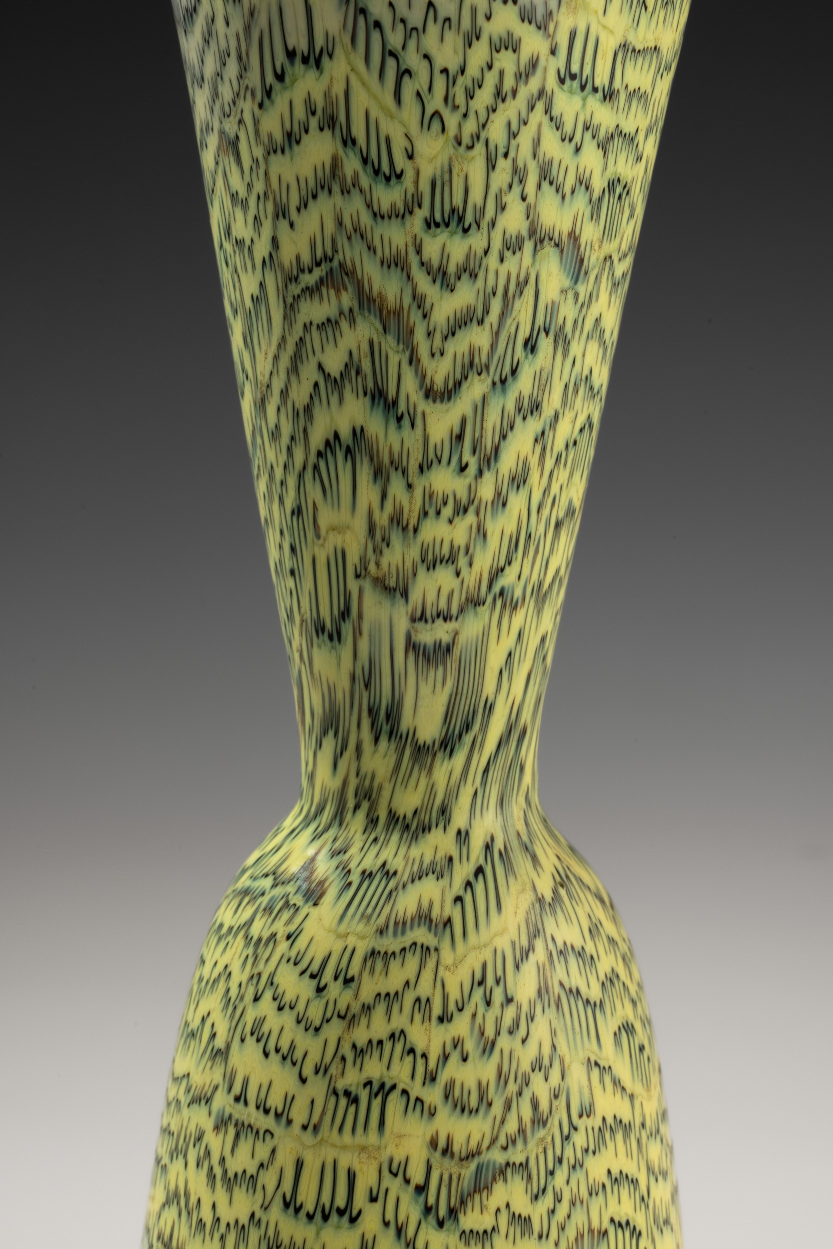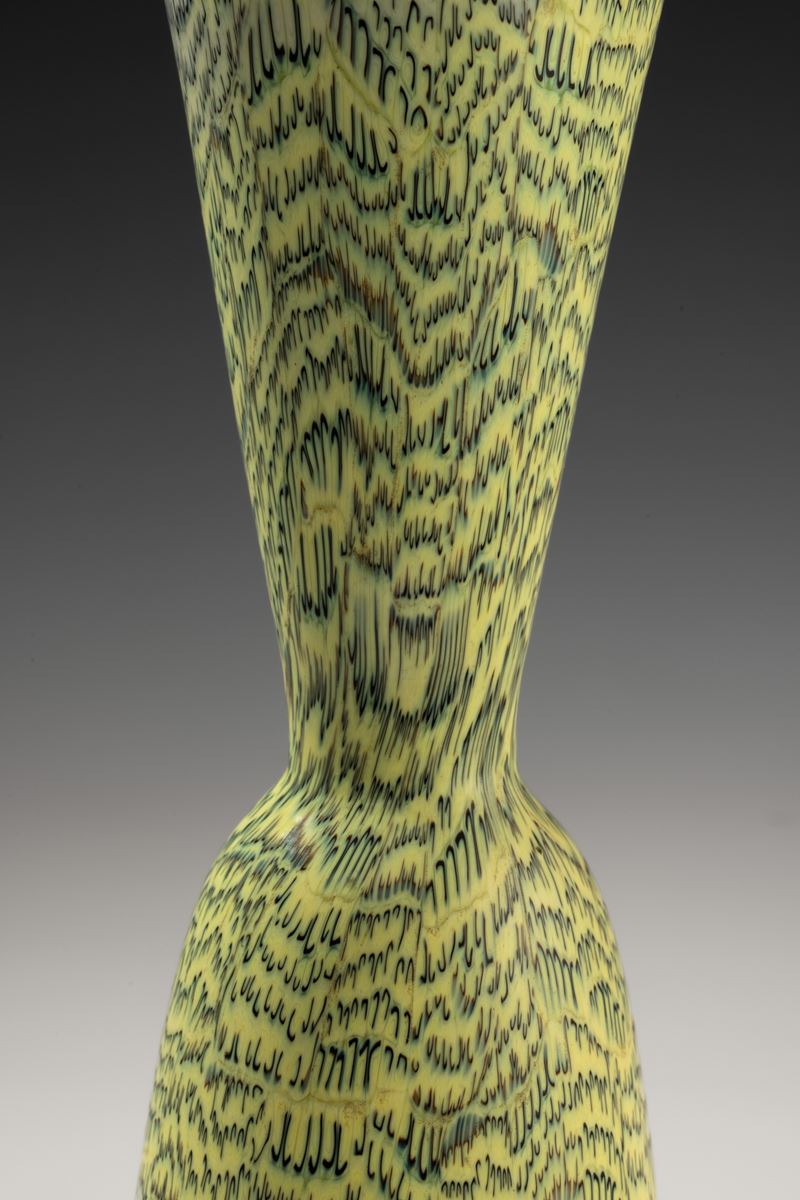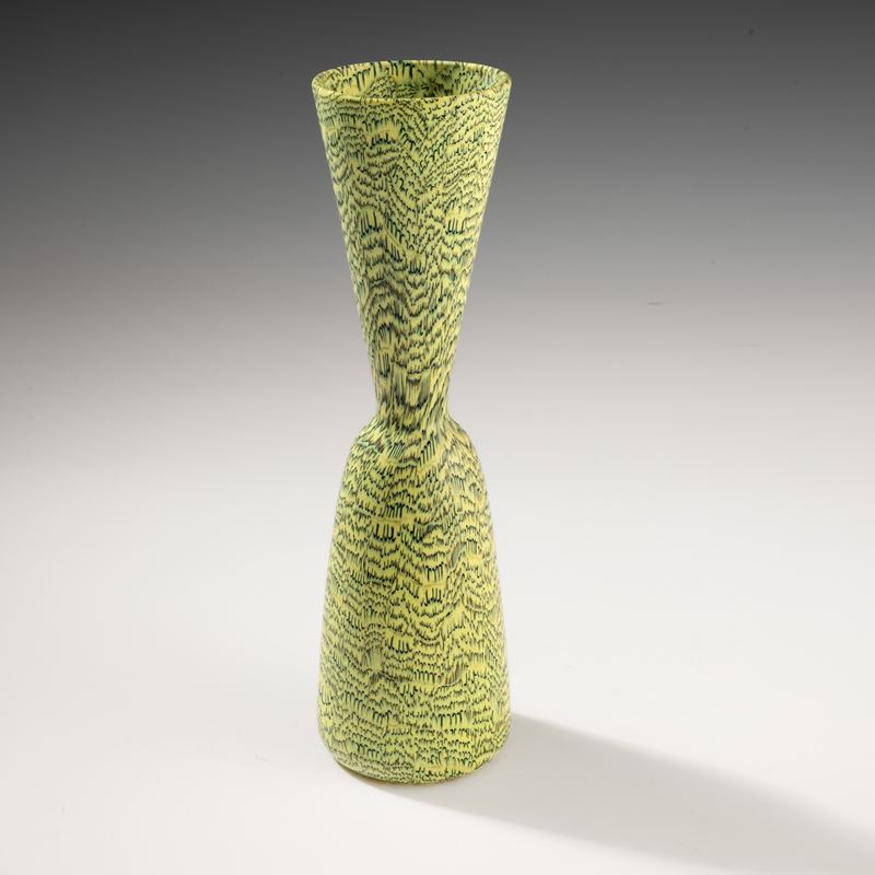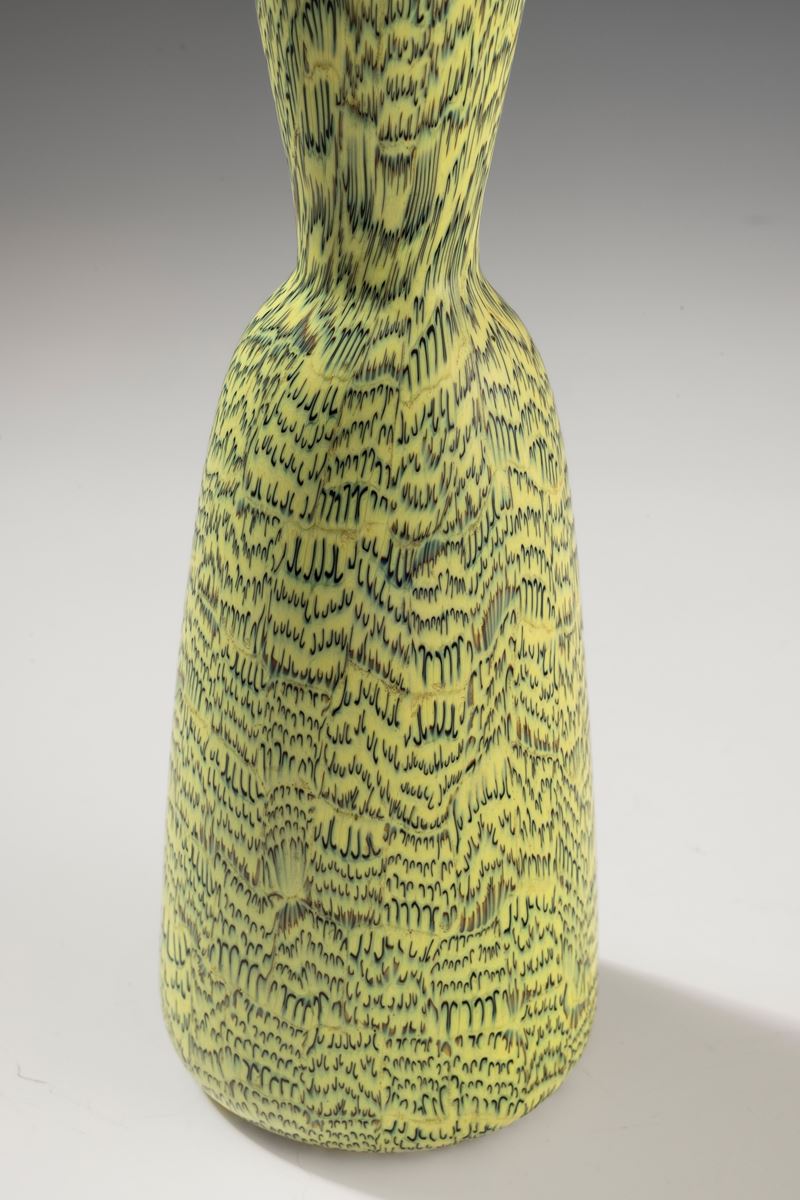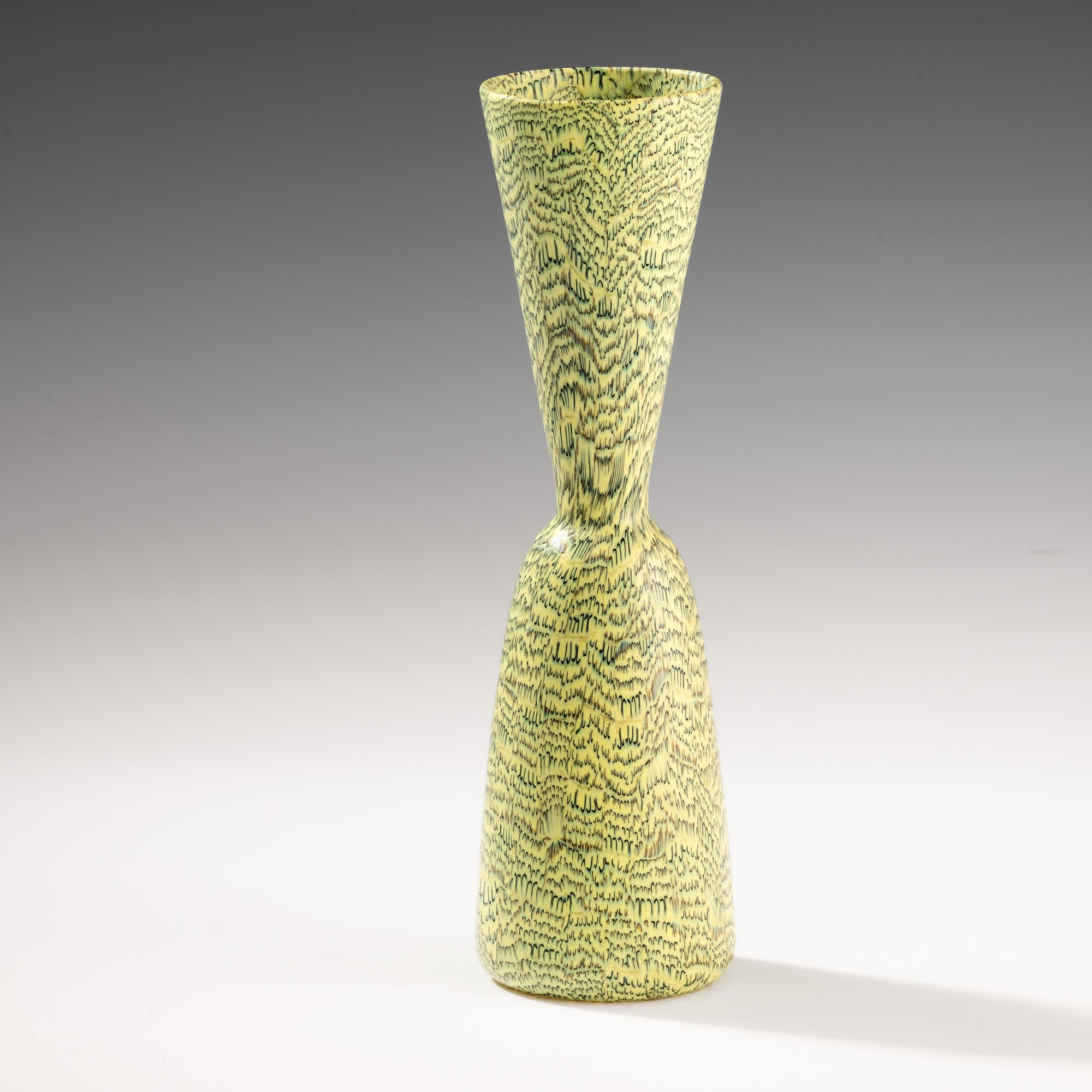 Rare hourglass-shaped vase in blown glass with decoration of black and zolfo crescent-shaped murrine. Acid-etched signature “Venini Murano Italia".