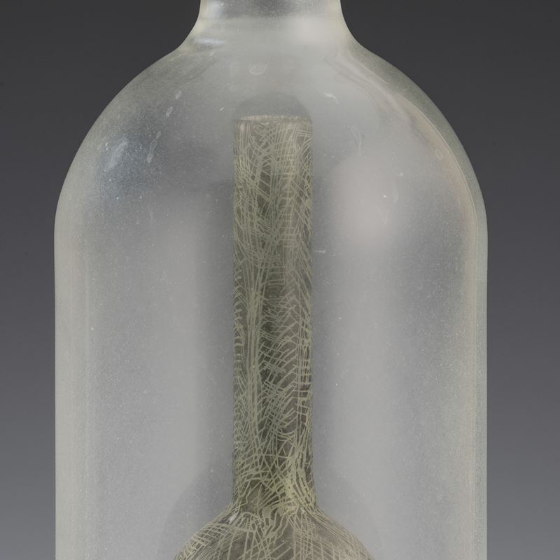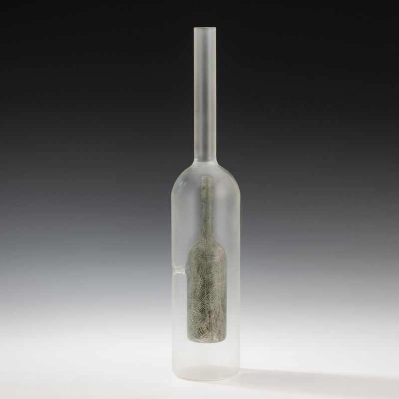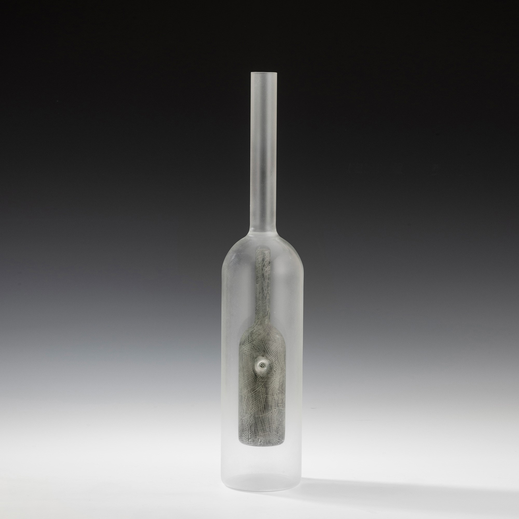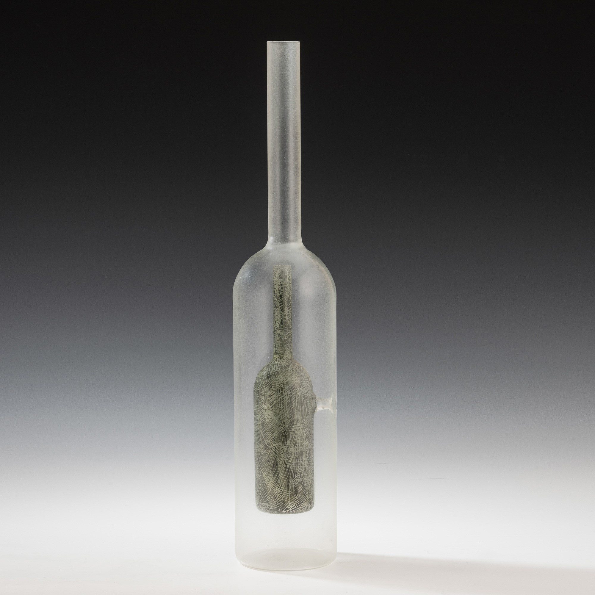 Bottle-shaped sculpture in blown glass with veiled surface.
