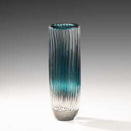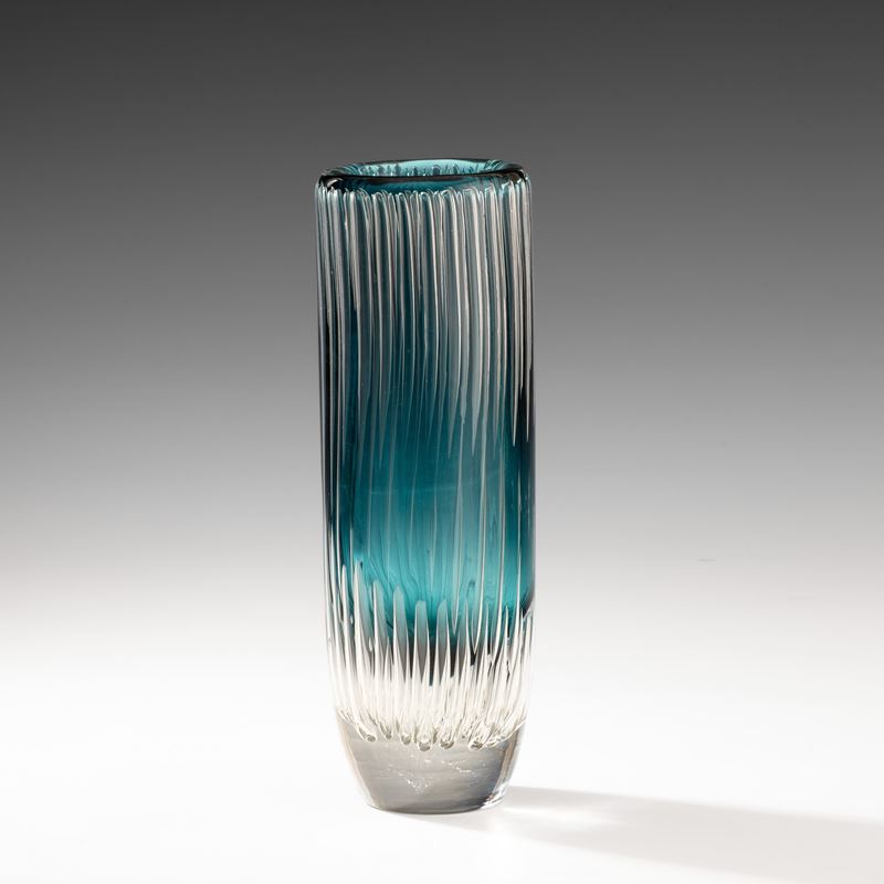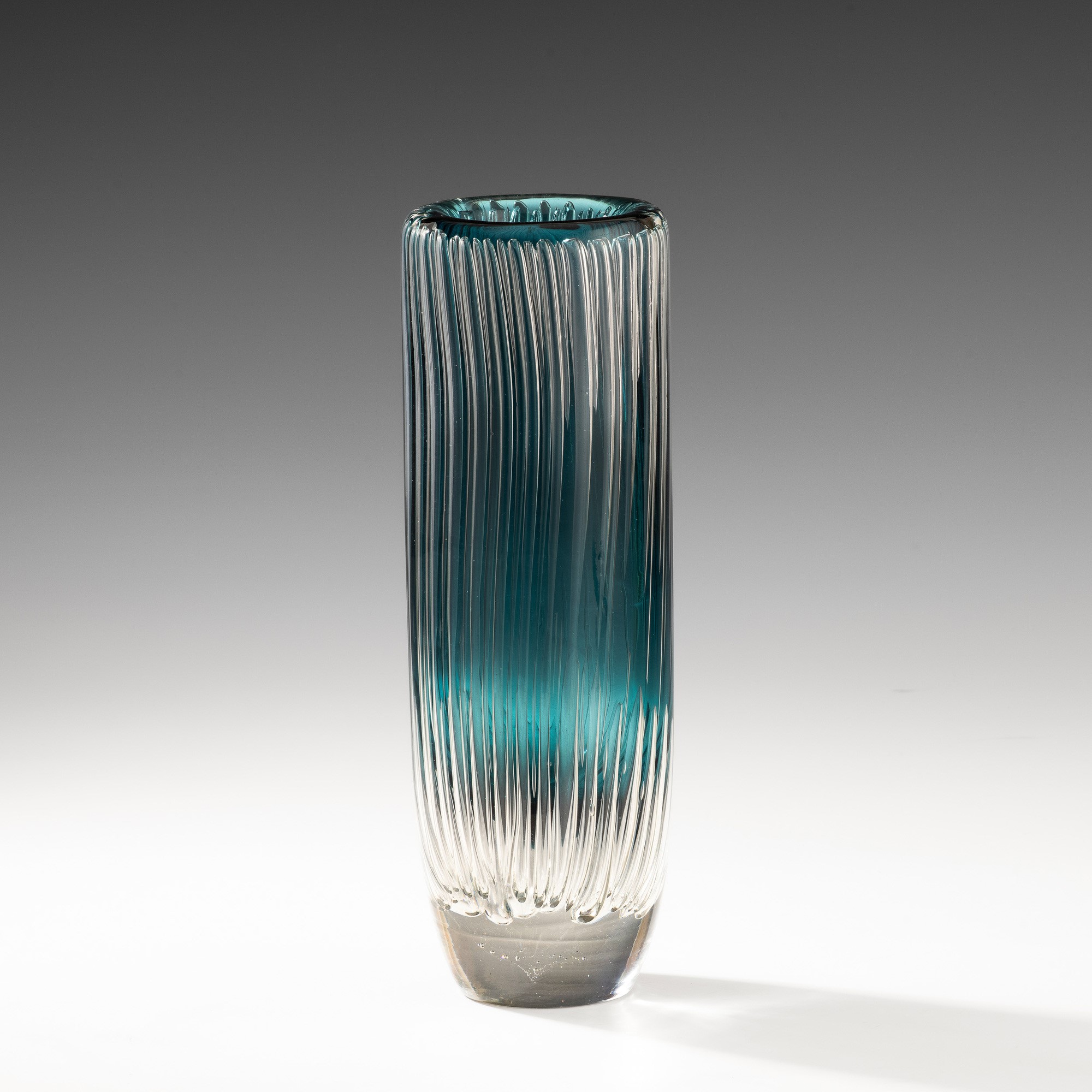 Artist proof cylindrical vase in heavy sommerso glass with decoration of vertical bubbles.