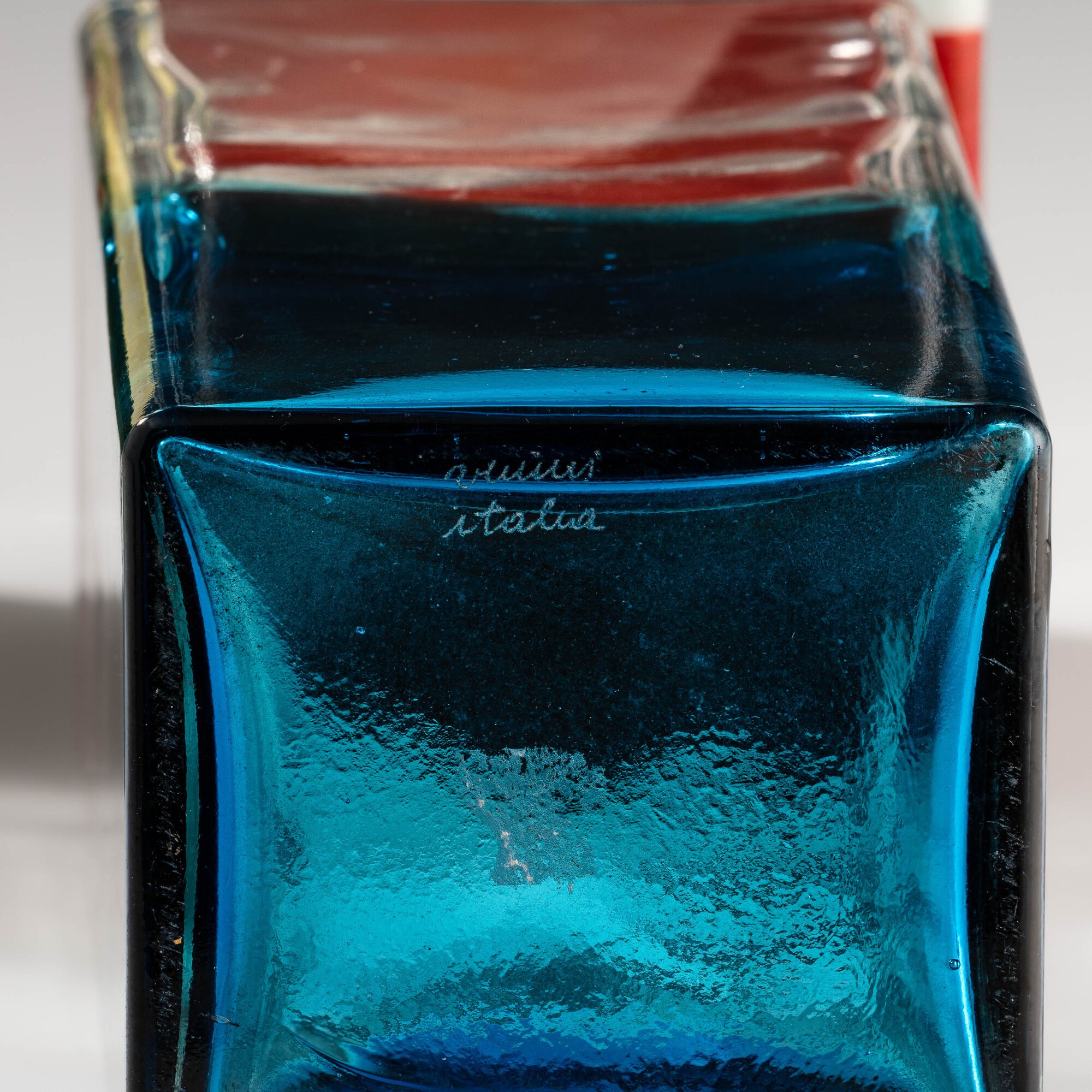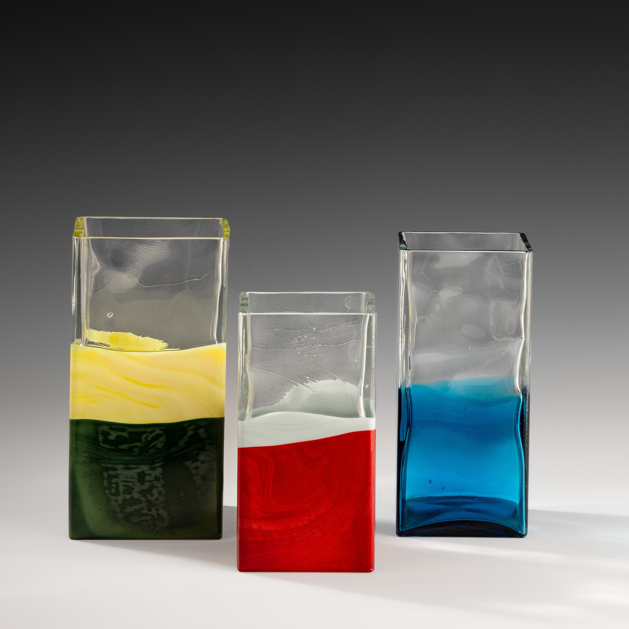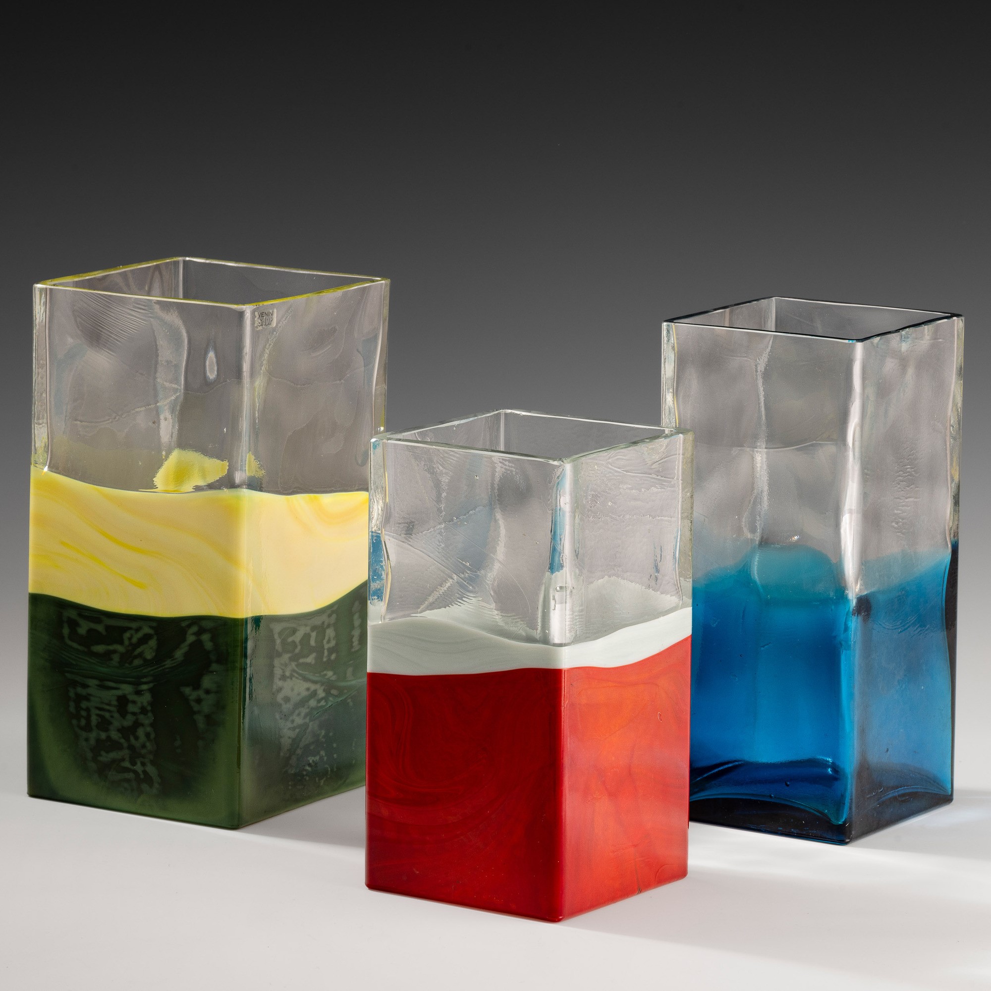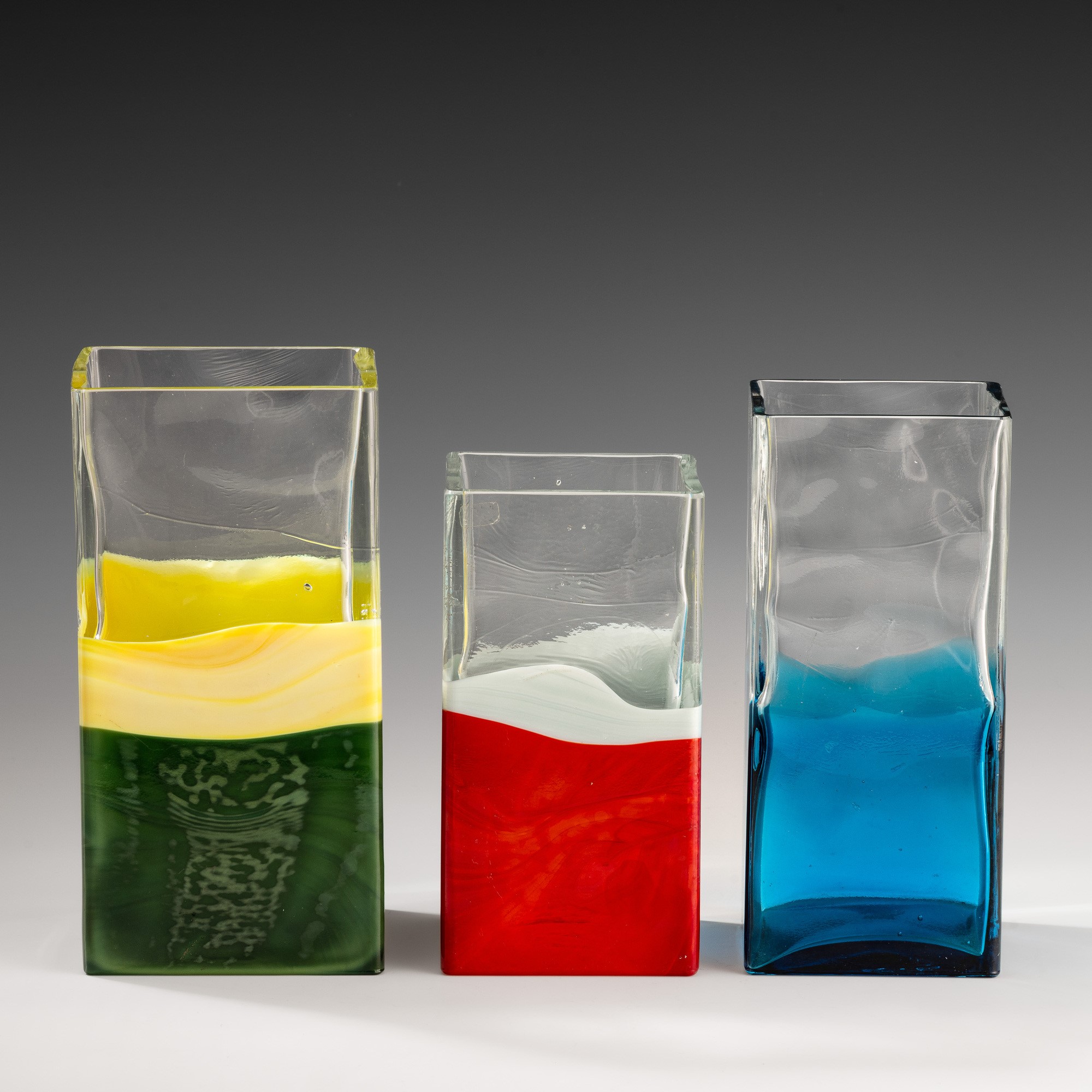 Lot of three square-section Mocenigo series vases in heavy glass with decoration of submerged polychrome bands.