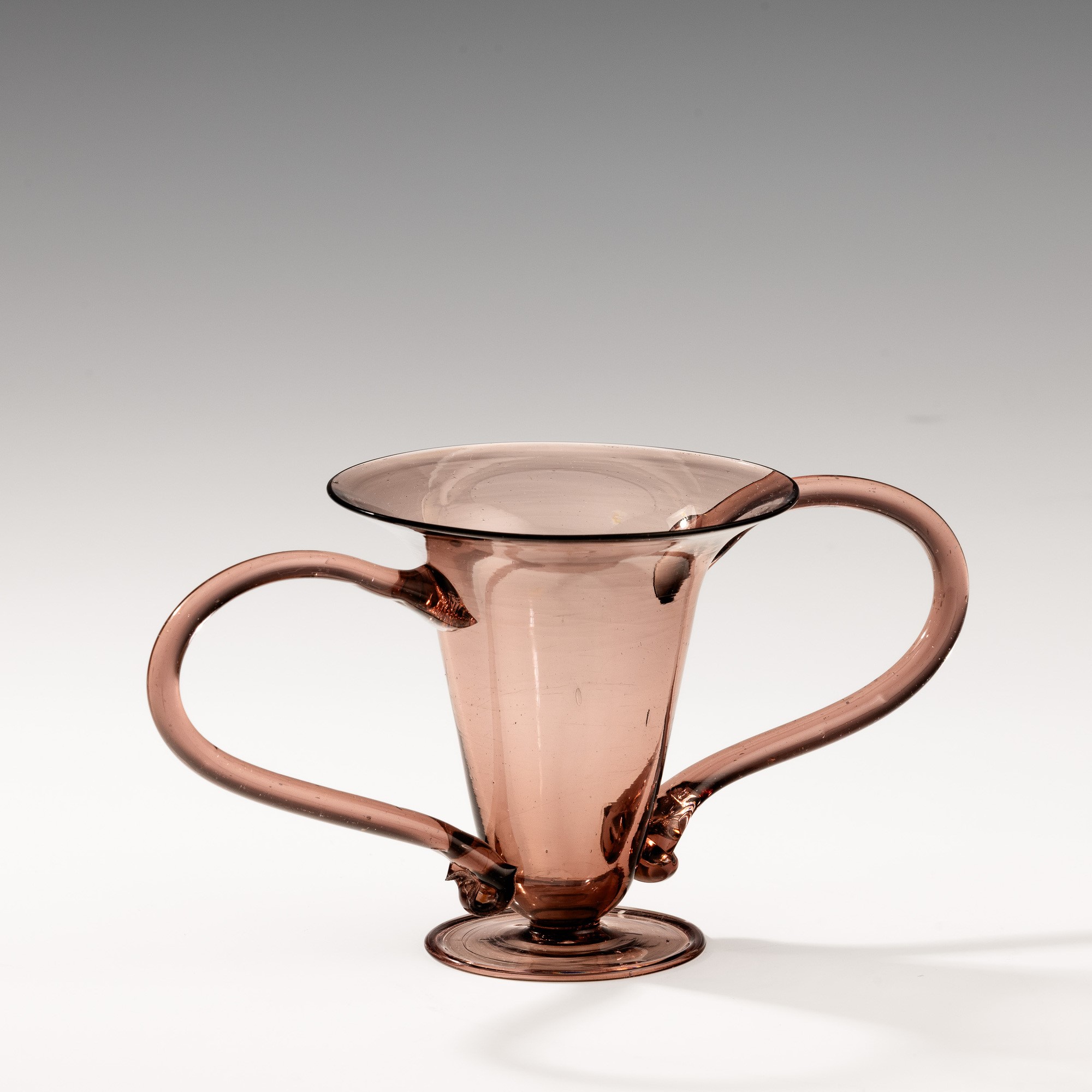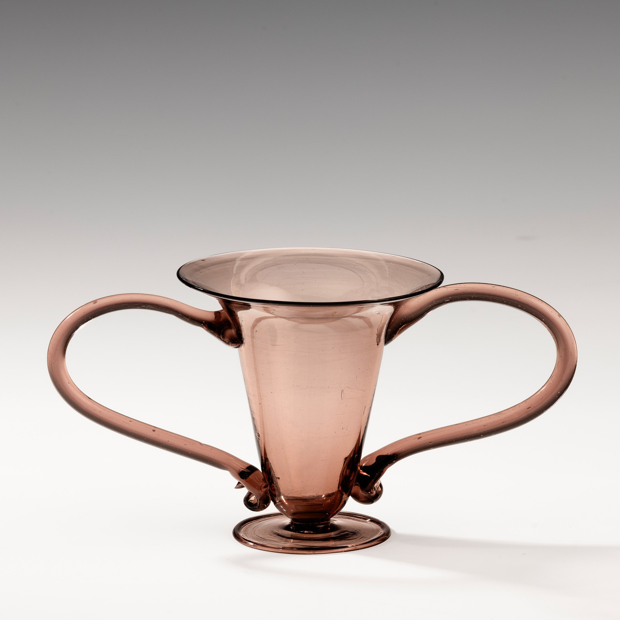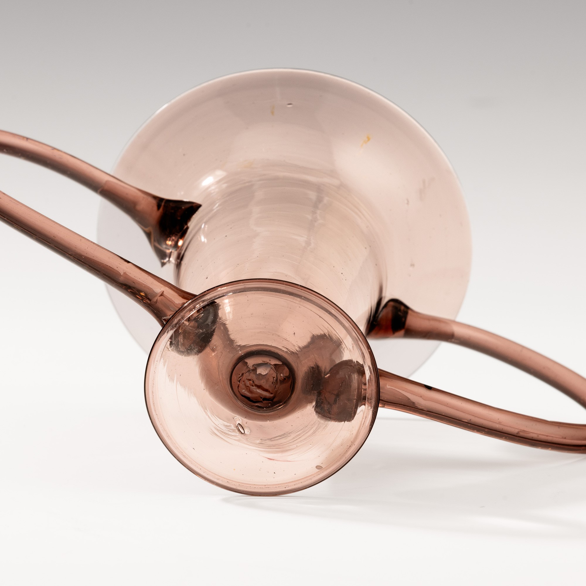 “Libellula” vase in cyclamen blown glass with large applied handles. Disc foot.