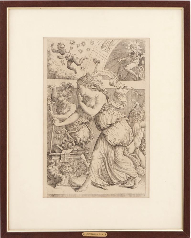 Bella incisione eseguita ad acquaforte, bulino e puntasecca. I/II. Monogrammi incisi a sinistra “Z.B.M”. 1557 e a destra “D.B”. Dimensioni: incisione 37x23,9; foglio cm 41,5x27,8; cornice cm 45,5x56