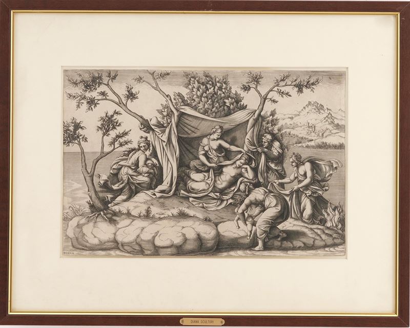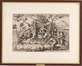 Incisione a bulino. Piccolo timbro di collezione riconducibile a quella di Jonatthan Richardson. Buon esemplare impresso su carta coeva con filigrana “scudo” nel II/VI secondo la catalogazione di Bellini. Entro cornice.