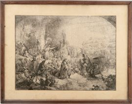 Acquaforte e puntasecca. Incisione tratta, presumibilmente nel XVIII-XIX secolo, dall'omonimo dipinto di Rembrandt. Foxing. Entro cornice