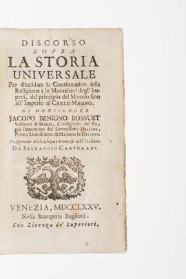 Bossuet, Jacopo Benigno (1627-1704) Discorso sopra la storia universale Venezia, Baglioni, 1775.
