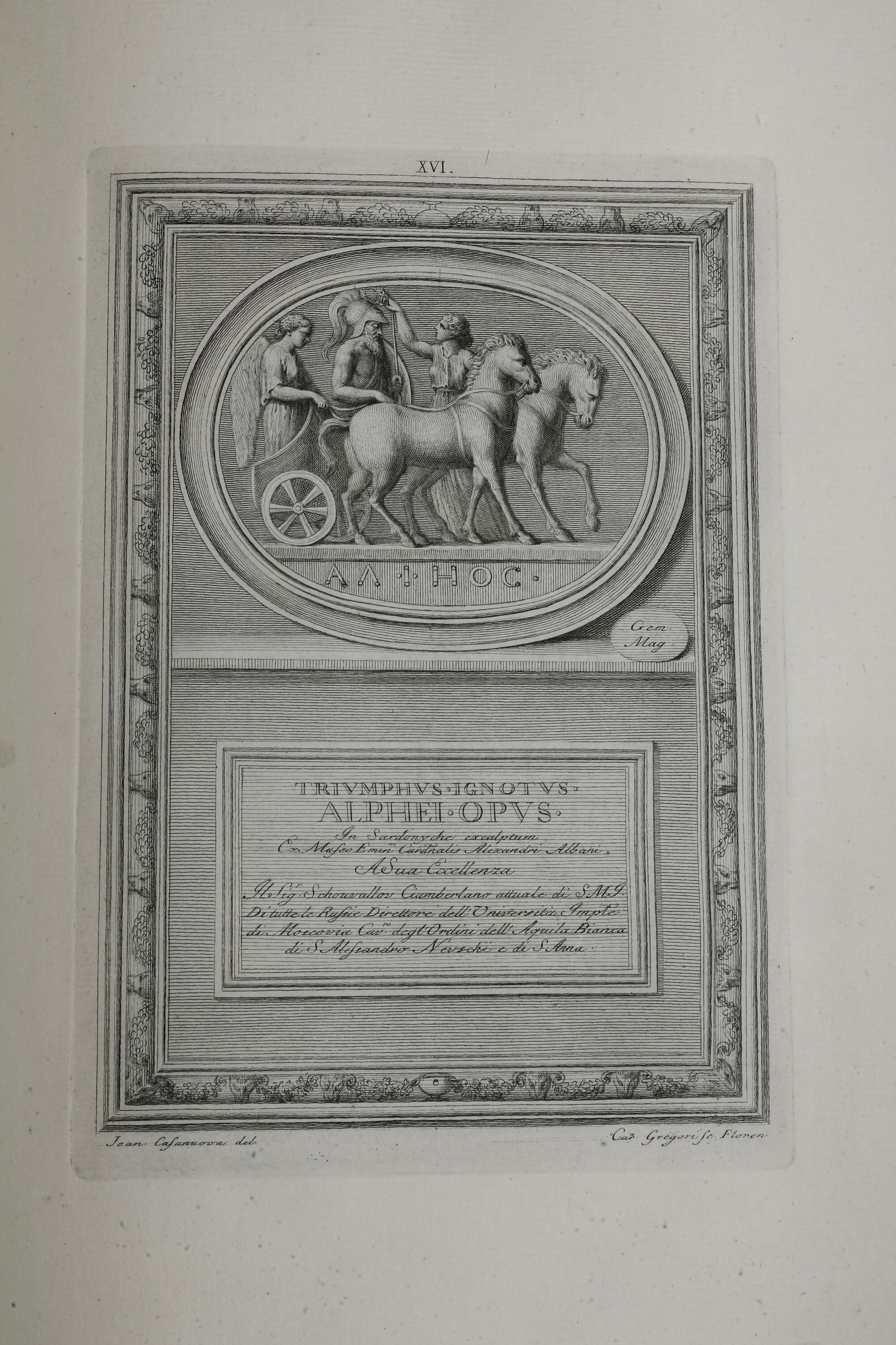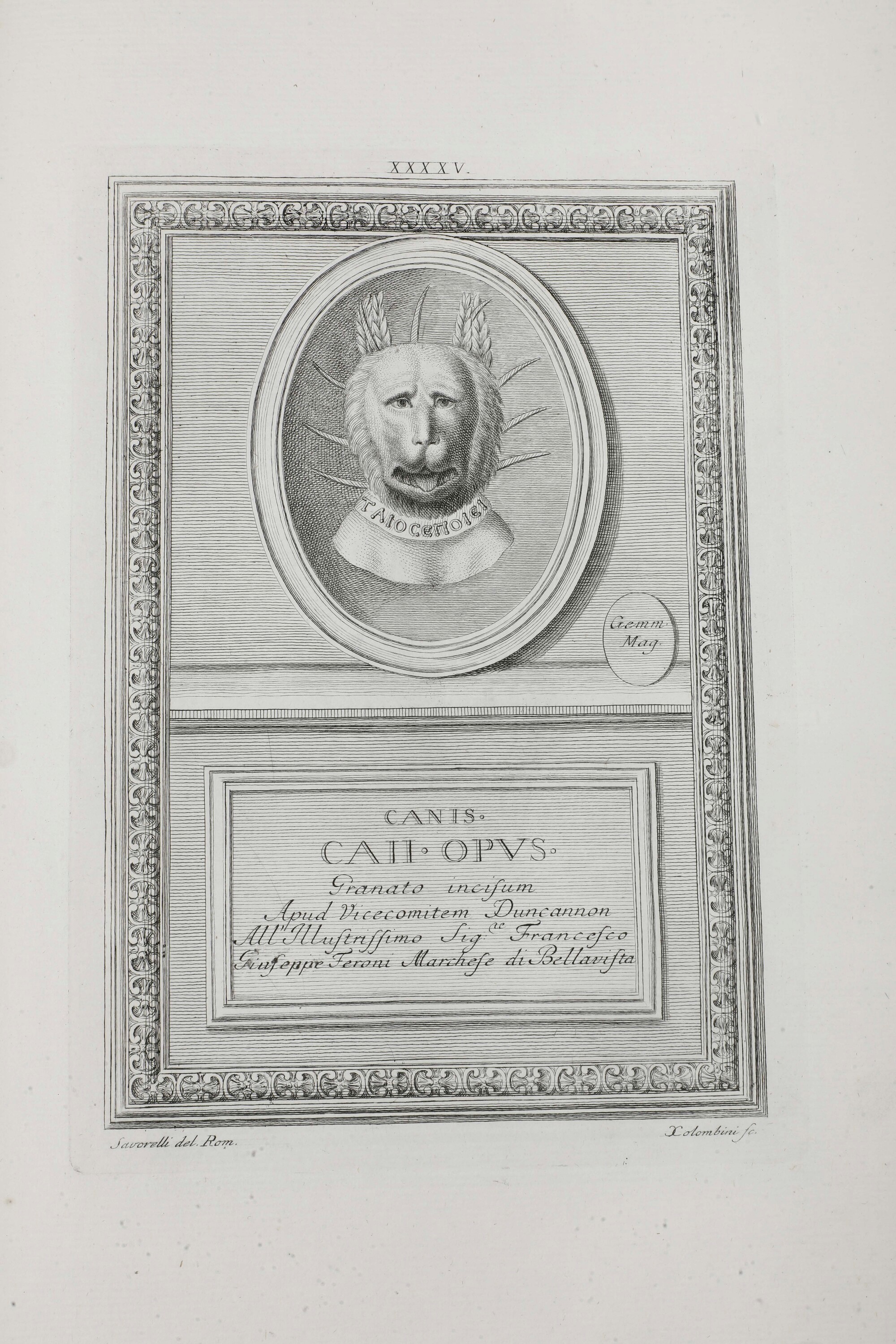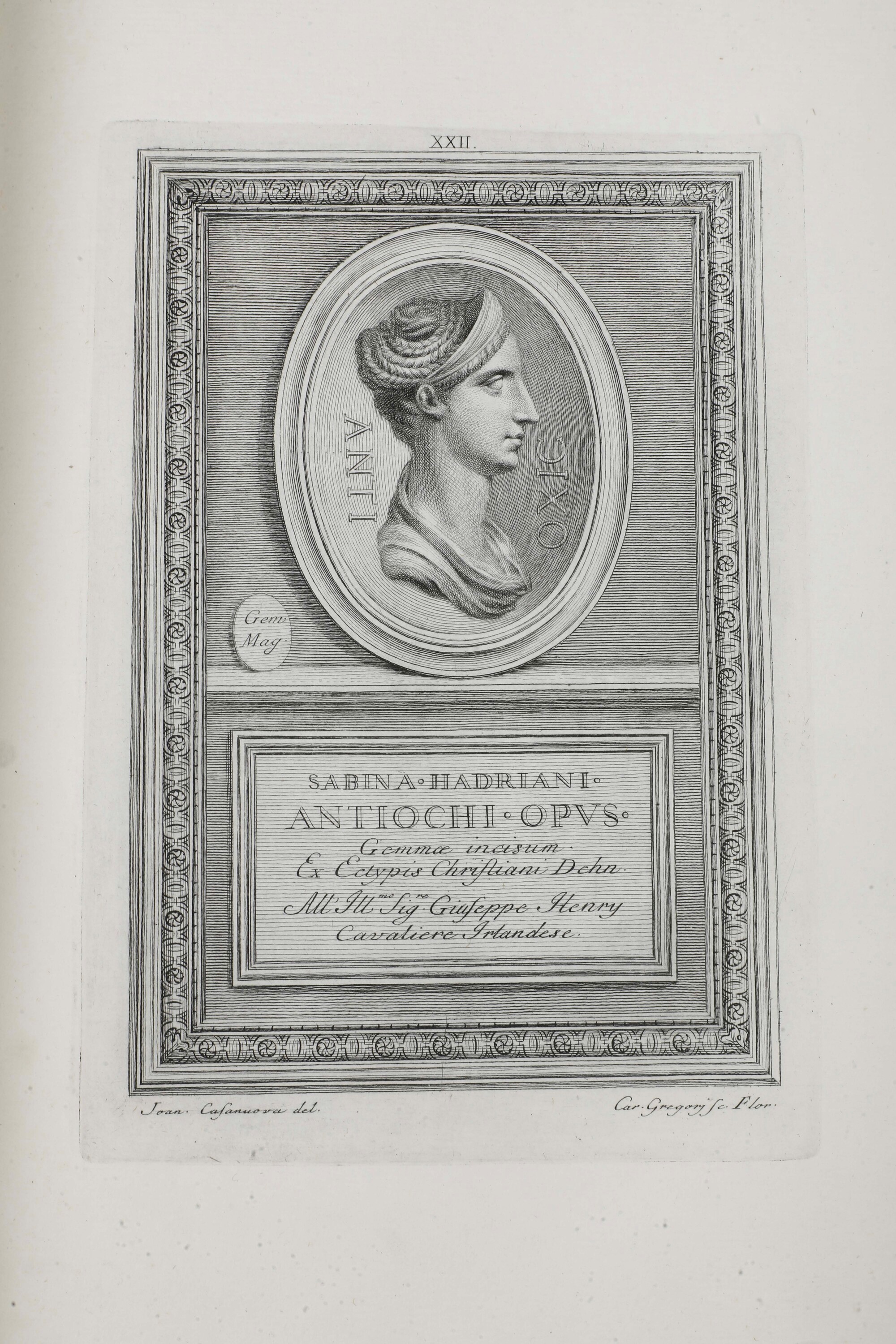 Due voll. in-folio atlantico. (mm 415x284). Rilegature moderne in mezza pelle e punte, ex libris nobiliare al contropiatto anteriore del vol. 1, tagli marmorizzati. Testo latino e italiano a fronte, 114 incisioni a tutta pagina sulle gemme e 46, di cui alcune doppie e triple, su altri monumenti. Bell'esemplare fresco e marginoso, con rare macchie e fori di tarlo
