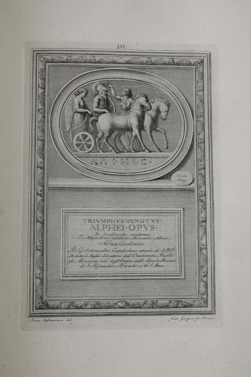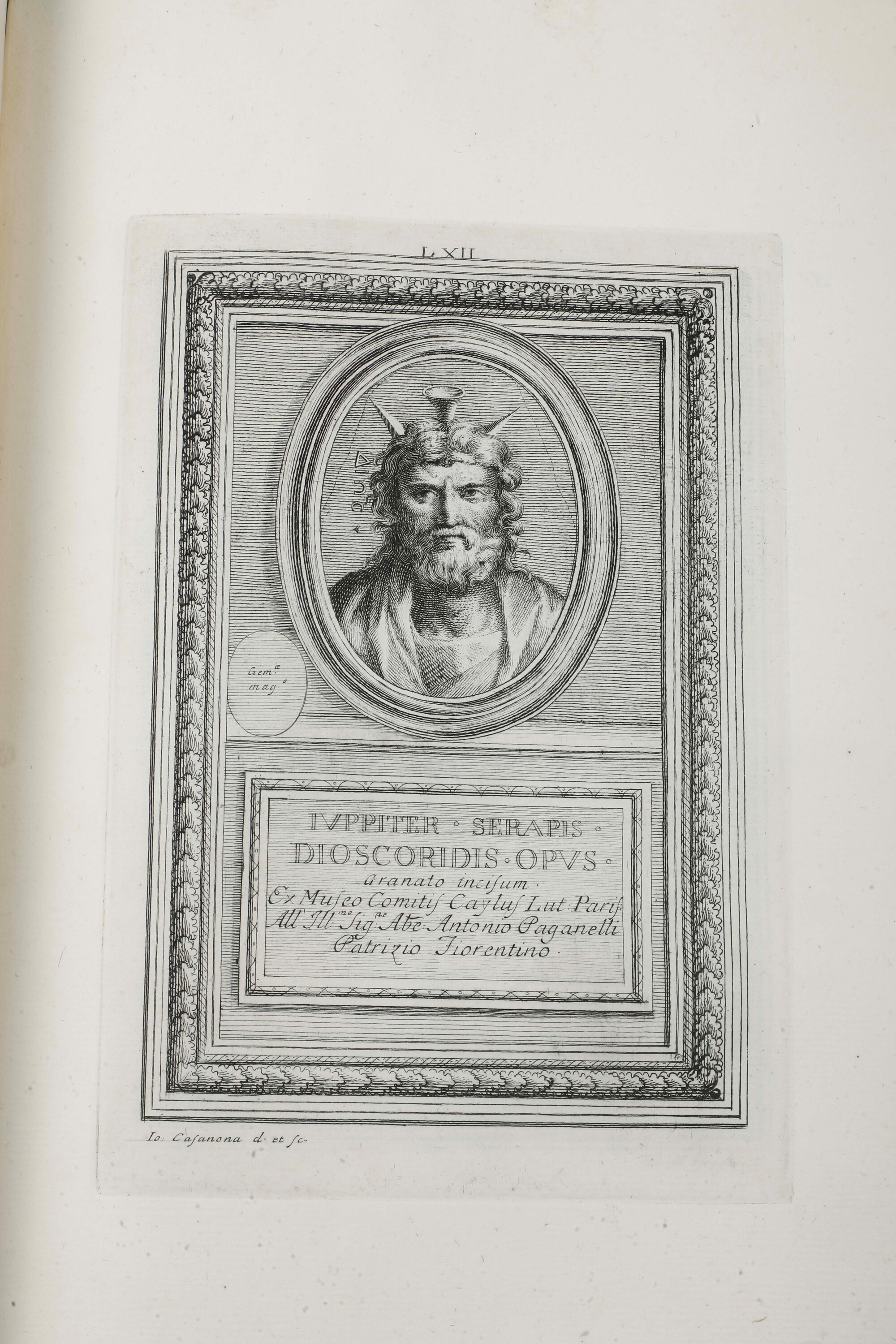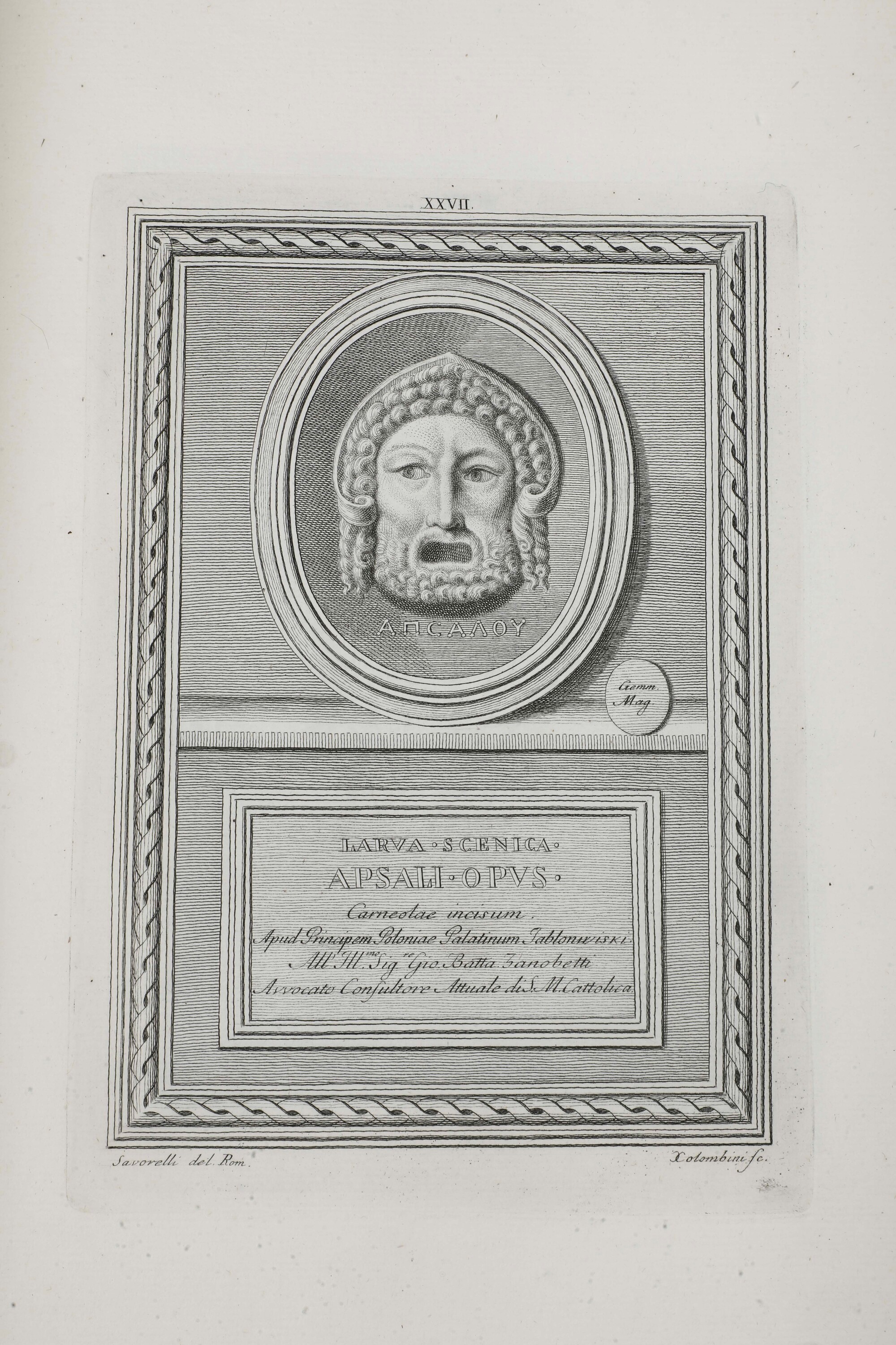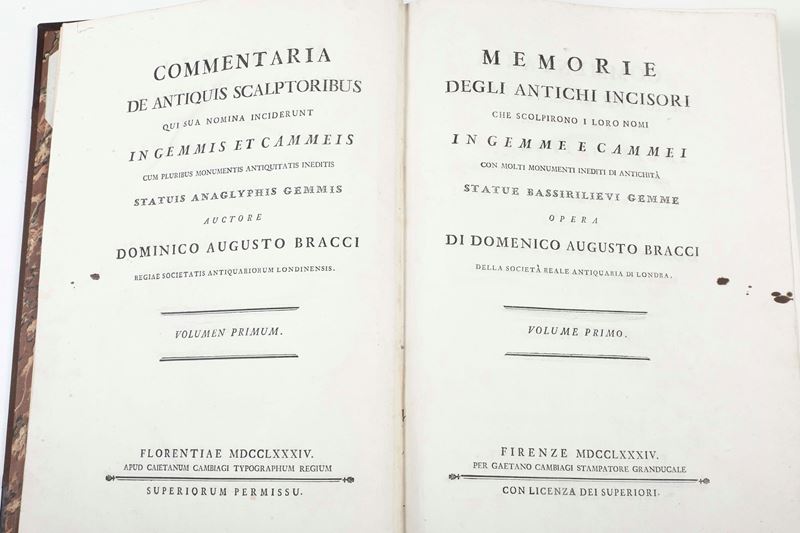 Due voll. in-folio atlantico. (mm 415x284). Rilegature moderne in mezza pelle e punte, ex libris nobiliare al contropiatto anteriore del vol. 1, tagli marmorizzati. Testo latino e italiano a fronte, 114 incisioni a tutta pagina sulle gemme e 46, di cui alcune doppie e triple, su altri monumenti. Bell'esemplare fresco e marginoso, con rare macchie e fori di tarlo